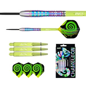Chameleon Jade Benannt nach dem farbenfrohen Chamäleon besticht auch die gleichnamige One80 Serie mit einem auffälligen stylischen Look. Alle Modelle der Chameleon Serie wurden mit einem mehrfarbigen Rainbow Coating beschichtet und aus 90%igen Tungsten gefertigt. Neben dem Aussehen ist auch jedes der verschiedenen Gripmuster außergewöhnlich gestaltet. Der Chameleon Jade hat einen geraden Barrel. Dieser ist…