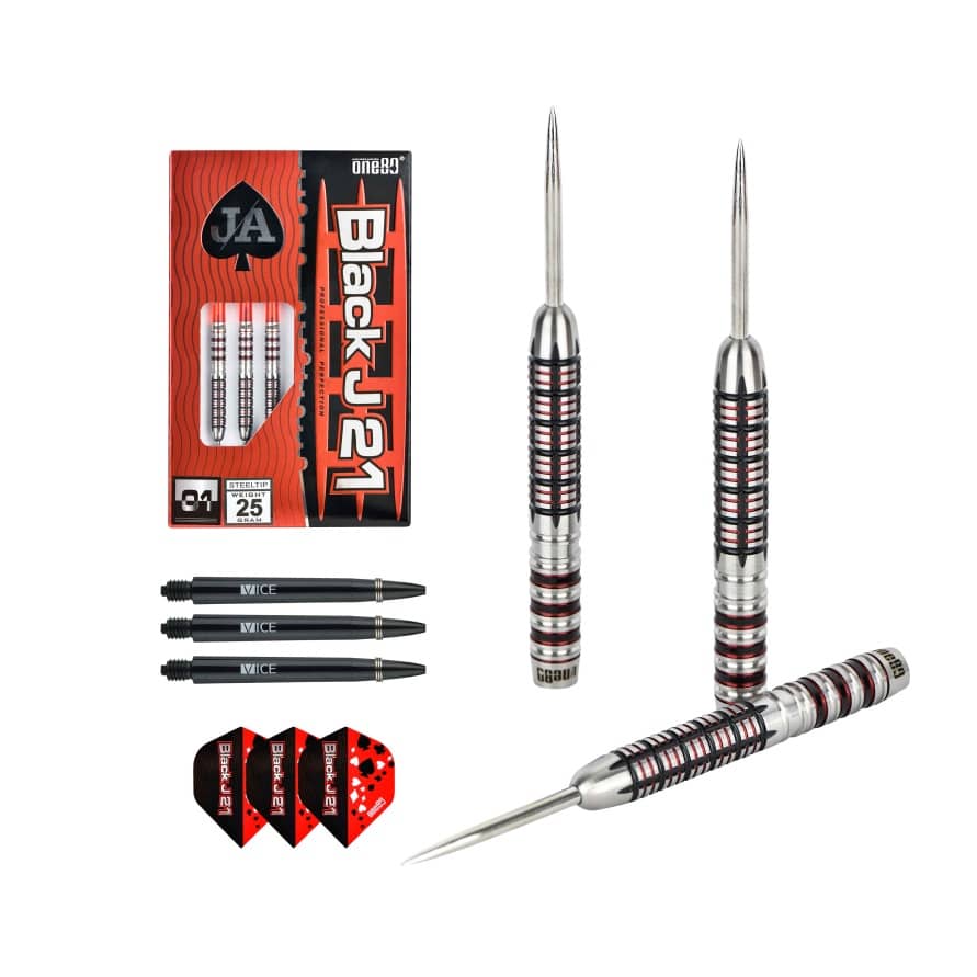 One80 hat die Black J21 Serie mit 4 unterschiedlichen Barrels auf den Markt gebracht. Jedes Barrel verfügt über eine eigene Form, sodass du die Wahl aus unterschiedlichem Grip und Design hast. Farblich wurde der Dart mit einem silbernen Barrel versehen der als optische Highlights schwarze und rote Ringe aufweist. Die Barrels haben 3 unterschiedliche Grip Zonen, was dir sehr guten Halt bietet.