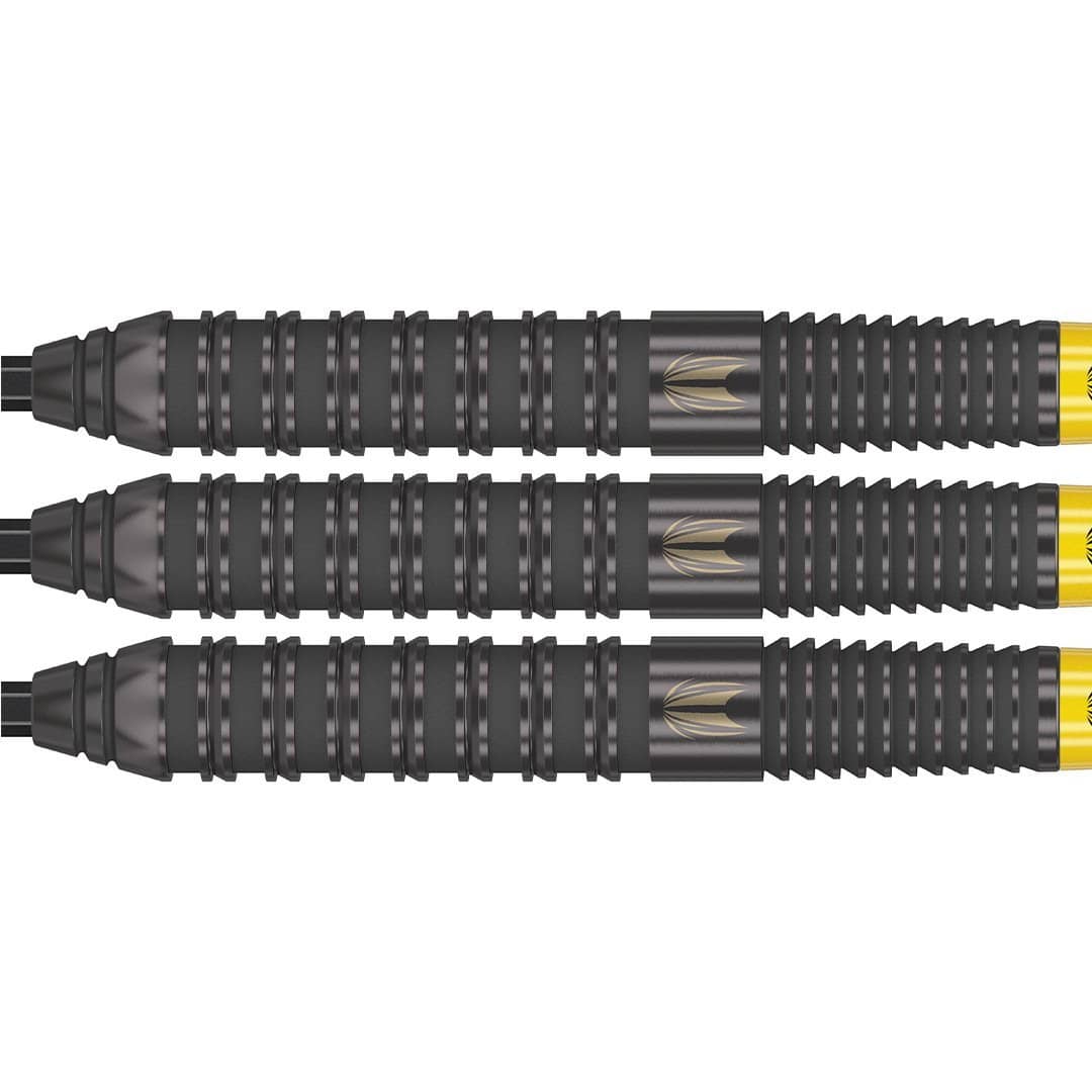 Mit einer atemberaubenden schwarzen Titanbeschichtung für eine zusätzliche Schicht der Haltbarkeit und verbesserte Ästhetik, die sandgestrahlten Radialrillen Griff ermöglicht eine bessere Kontrolle, so dass Sie das Vertrauen zu werfen mit Zielgenauigkeit. Die auf Präzision ausgelegten 90%igen Tungsten Barrels werden durch die beliebten Pro Grip Schäfte und Bolide Void Edition No.6 Flights ergänzt und mit den patentierten schwarzen 26mm Swiss Points von Target für einen komplett austauschbaren Dart abgeschlossen.