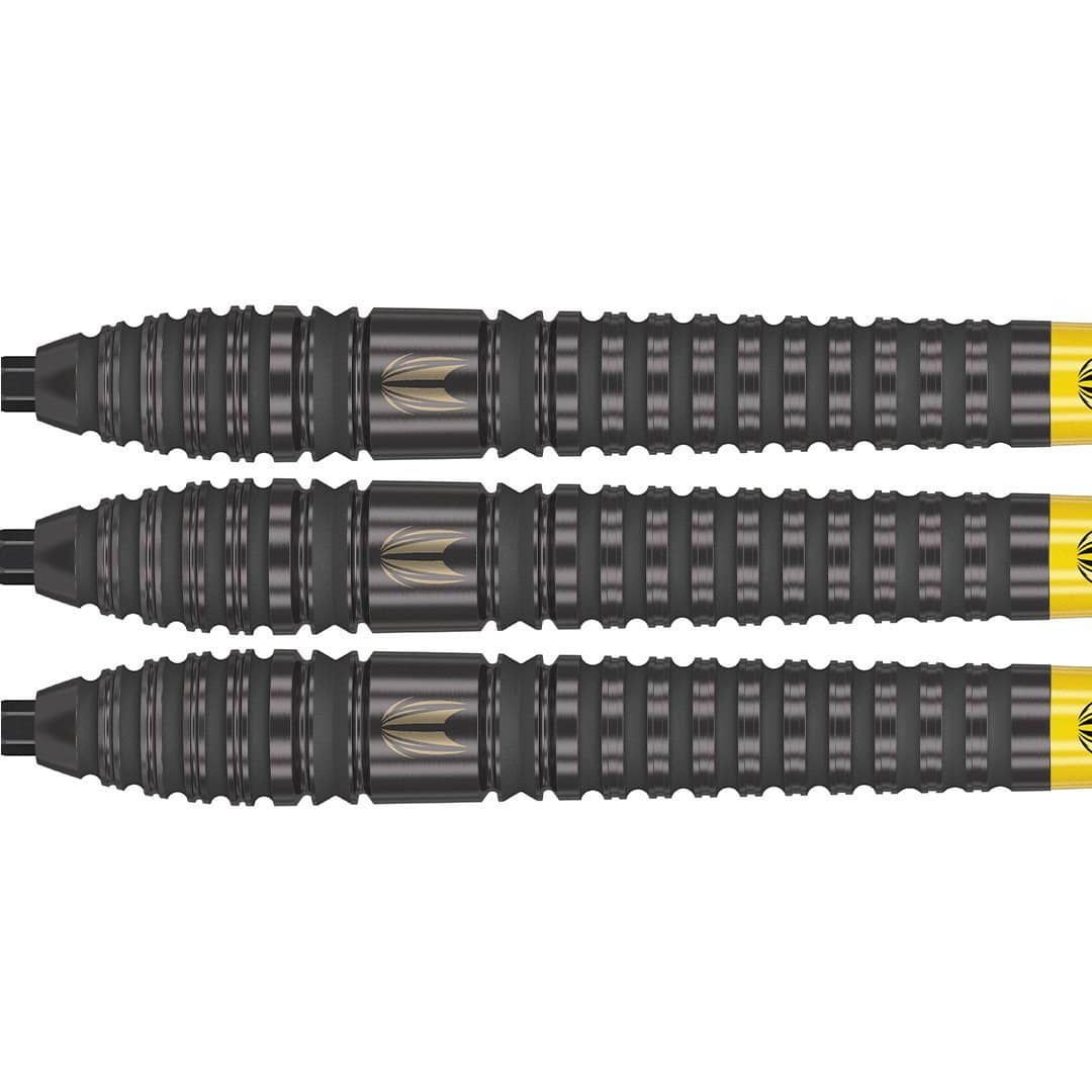 Mit einer atemberaubenden schwarzen Titanbeschichtung für eine zusätzliche Schicht der Haltbarkeit und verbesserte Ästhetik, die sandgestrahlten Radialrillen Griff ermöglicht eine bessere Kontrolle, so dass Sie das Vertrauen zu werfen mit Zielgenauigkeit. Die auf Präzision ausgelegten 90%igen Tungsten Barrels werden durch die beliebten Pro Grip Schäfte und Bolide Void Edition No.6 Flights ergänzt und mit den patentierten schwarzen 26mm Swiss Points von Target für einen komplett austauschbaren Dart abgeschlossen.