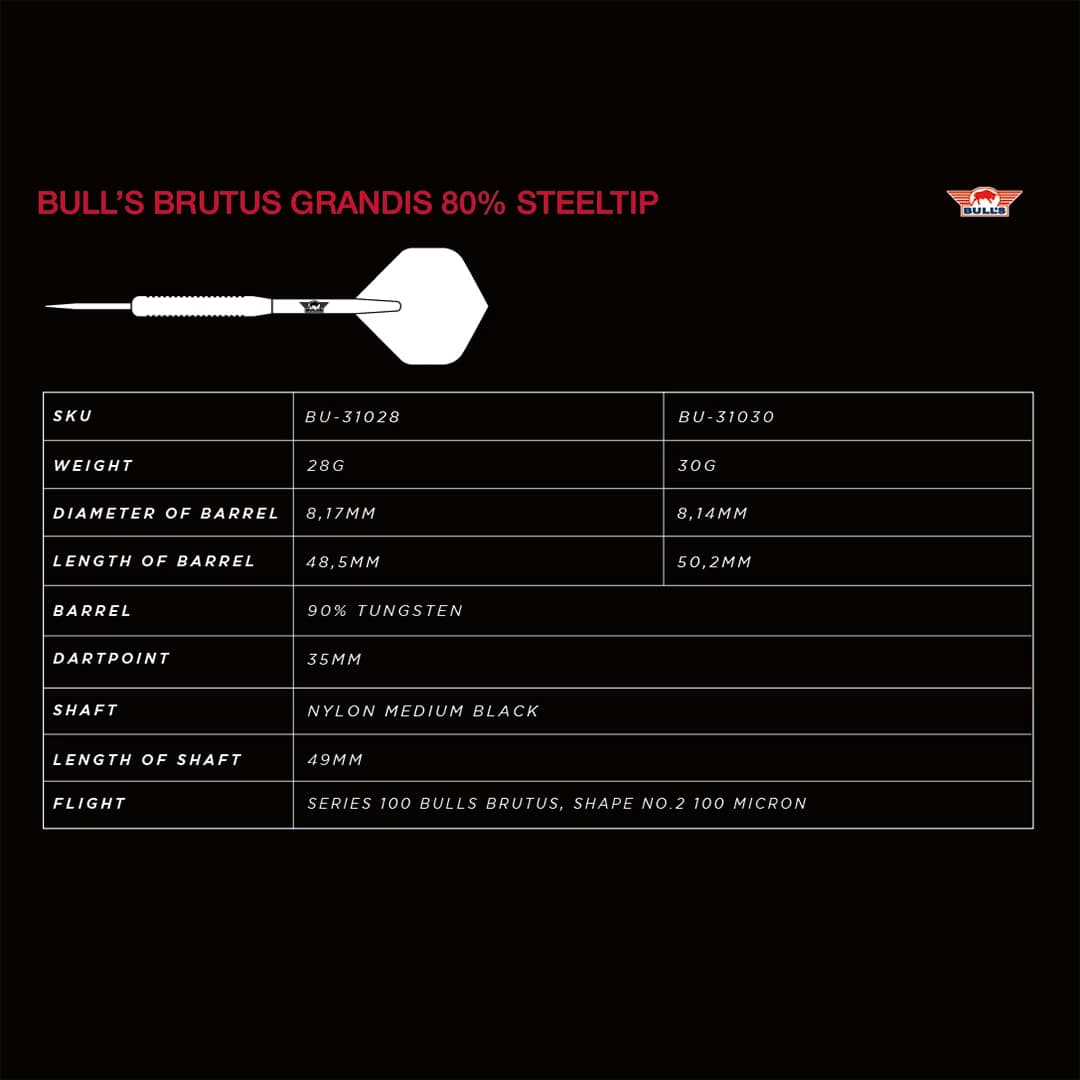 Wir präsentieren die Bull’s Brutus Grandis 80% Darts, ein Schwergewicht in der Dartwelt. Als Teil der renommierten Brutus-Serie sind diese Darts für ambitionierte Spieler konzipiert, die Wert auf Power, Präzision und ein hervorragendes Preis-Leistungs-Verhältnis legen. Sie bestehen aus 80 % Wolfram und bieten Langlebigkeit und ein schlankes Profil. Das gerade Barrel-Design sorgt für konstante Leistung und hilft Ihnen, engere Gruppierungen auf dem Dartboard zu erzielen.