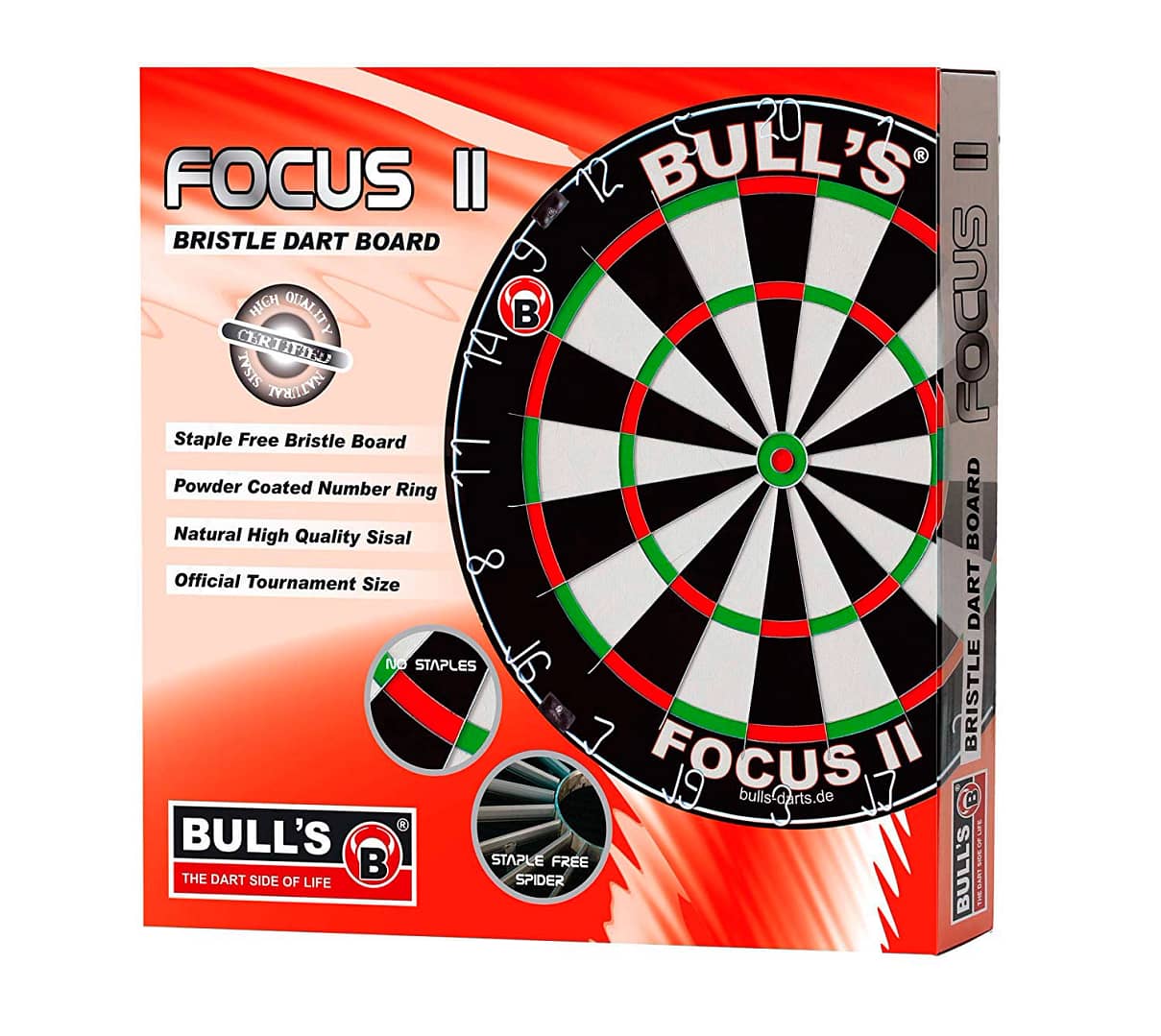 Das BULL’S Focus II ist aus hochwertigem afrikanischem Sisal hergestellt und erfüllt alle Ansprüche von Technik und Qualität internationaler Turnier Regularien. Ein modernes Dartboard für Turniere, Ligen und Clubs.Der Spider ist in das Sisal eingelassen und verhindert somit Bouncer (Abpraller) beim Wettkampf. Eine Nutzungsanleitung und eine Boardwandhalterung werden mitgeliefert.