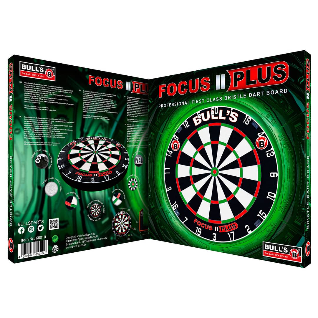 Das Focus II Plus ist der Beginn einer neuen Dartboard Ära. Dieses Board ist das beste BULL’S Dartboard aller Zeiten. Seit über 30 Jahren steht BULL’S für Innovation und Qualität und findet hiermit seinen vorläufigen Höhepunkt. Akribisch wurden alle Komponenten des Focus II Plus geplant, entworfen und miteinander zu diesem einzigartigen Dartboard verschmolzen. High End Dartboard-Technologie in einem umwerfenden Design. Das Herzstück ist das herausragende afrikanische Sisal. Langlebig und höchsten Ansprüchen gewachsen. Die neuartiger Sisalverarbeitung kreiert ein erstaunlich kontrastreiches und hochwertiges Trefferfeld. Diese neue Sisalverarbeitung erleichtert ebenfalls das Eindringen der Darts in das Board und stabilisiert den Dart im Board. Dieses Verfahren ermöglicht ein sehr tiefes einlassen des Spiders im Sisal, Bouncer (Abpraller) werden damit nahezu ausgeschlossen. Durch das tief eingelassene, extra dünne Spider wird die Trefferfläche optimiert, dieses wird vor allem im Bereich des BULL’S Eyes im Vergleich zu herkömmlichen Dartboards deutlich. Das angewandte Spider-Leg-Free-Verfahren ermöglicht es, dass keine Metallhalterungen rund um das Trefferfeld zu sehen sind. Der Gesamteindruck des Dartboards wird dadurch erheblich gesteigert. Der scharfe High-Quality-Aufdruck sowie die modernen Metallnummern vollenden den herausragenden Gesamteindruck des Focus II Plus. Die Metallnummern befinden sich an einem drehbaren und pulverbeschichteten Nummernring, Reflexionen werden dadurch vermieden. Das Focus II Plus besitzt exakte Turniermaße (45,5 x 3,8 cm) und entspricht damit internationalen Turnierregularien. Eine Nutzungsanleitung und eine Boardwandhalterung werden mitgeliefert.