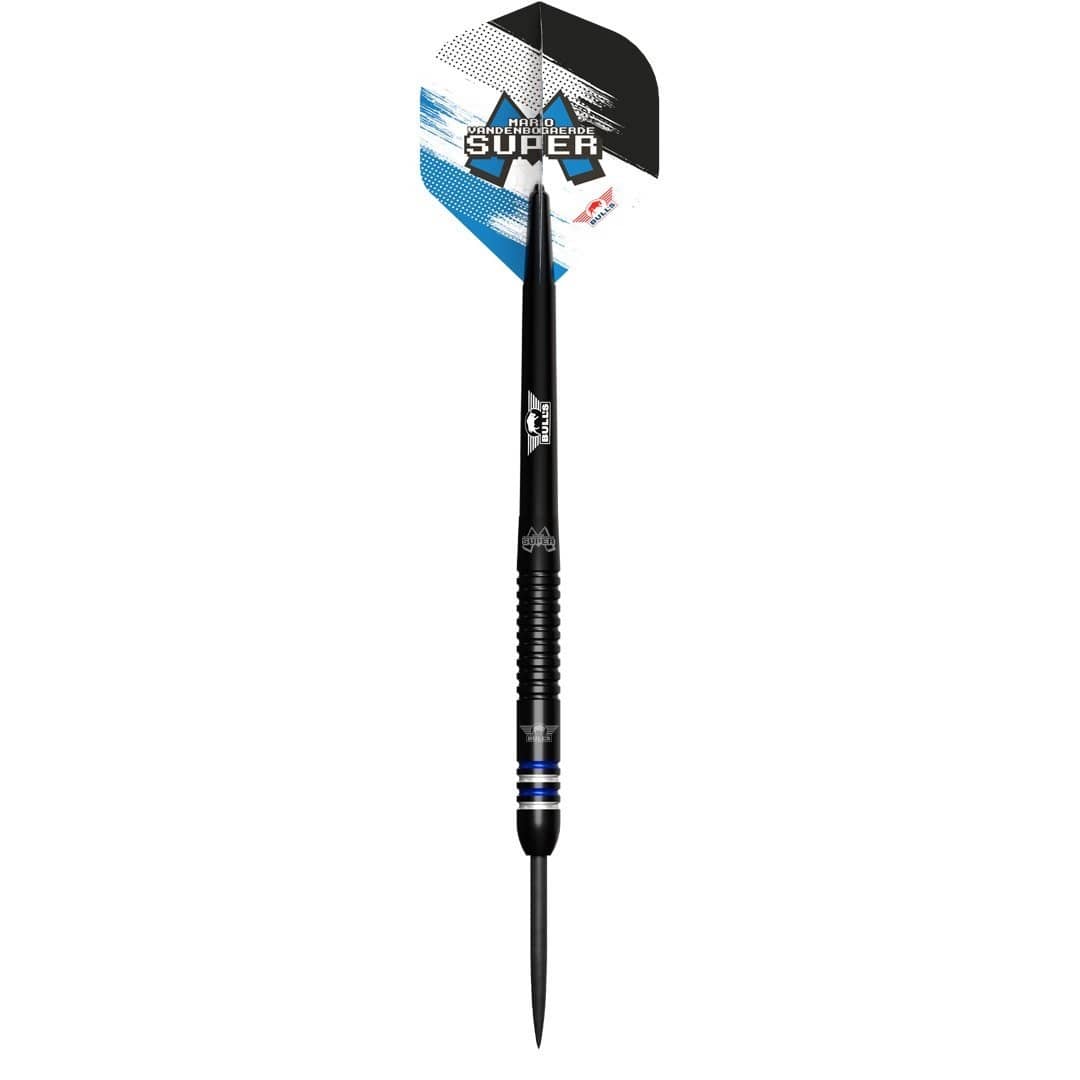 Der schwarze Schaft ist mit Marios charakteristischen Blau- und Weißtönen akzentuiert und verleiht diesem professionellen Dart einen stilvollen Touch. Jeder Dart ist mit dem Bull’s-Logo graviert und wird mit personalisierten Mario Vandenbogaerde Flights geliefert, die auch separat erhältlich sind.