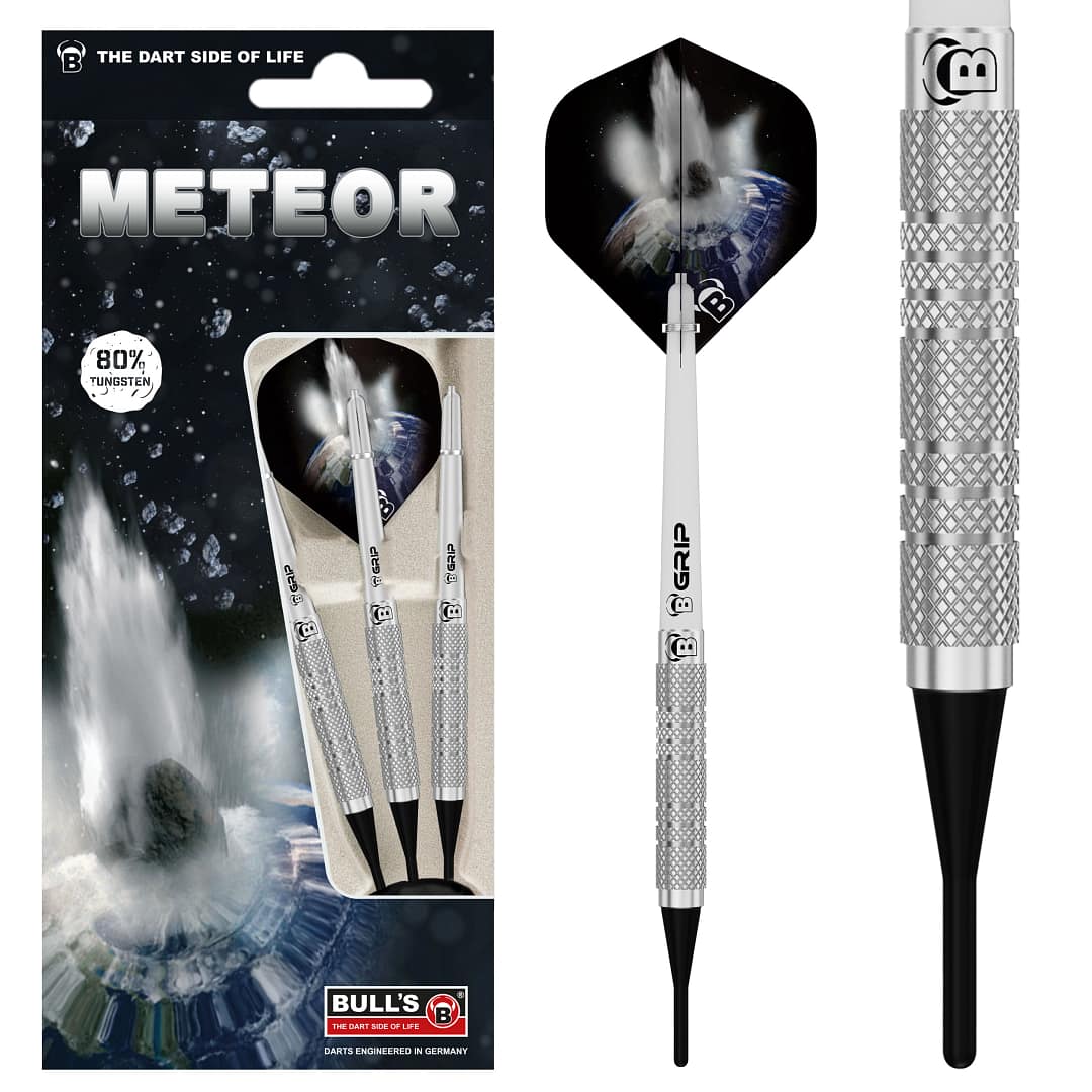 Der Bull´s Meteor MT2 Soft Dart ist der ideale Einstieg in die Tungsten-Klasse. Gefertigt aus hochwertigem 80% Tungsten stehen vier Barrelvarianten mit unterschiedlichen Gewichten und Grip zur Auswahl. Der MT2 ist ein gerades, schlankes Barrel und verfügt über einen Knurled Grip im vorderen und hinteren Bereich, erhältlich in drei unterschiedlichen Gewichten und Längen. Im handlichen BULL’S Cone Case mit B-Grip SL Schäften und Motex Flights im speziellen Meteor Design.