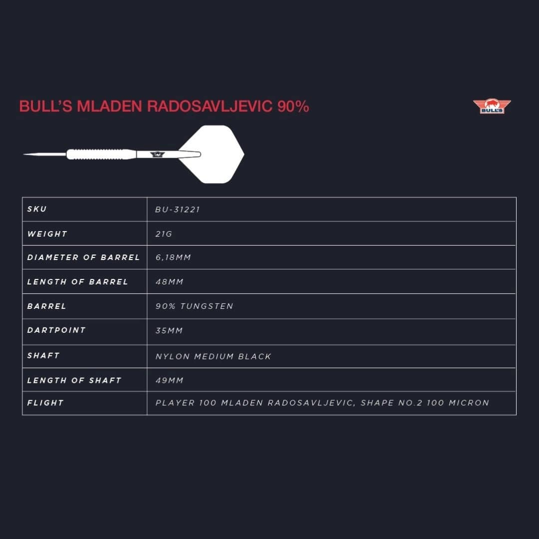 Die Bull’s Mladen Radosavljevic 90% Darts wurden speziell für die hohen Ansprüche des serbischen Profi-Dartspielers Mladen Radosavljevic entwickelt. Diese Darts bieten die perfekte Mischung aus Präzision, Haltbarkeit und Stil. Sie bestehen aus 90 % Wolfram und verfügen über ein schlankes Profil, das eine engere Gruppierung und höhere Scores ermöglicht. Erhältlich in 21 Gramm, bieten sie Spielern aller Spielstärken eine konstante Leistung.