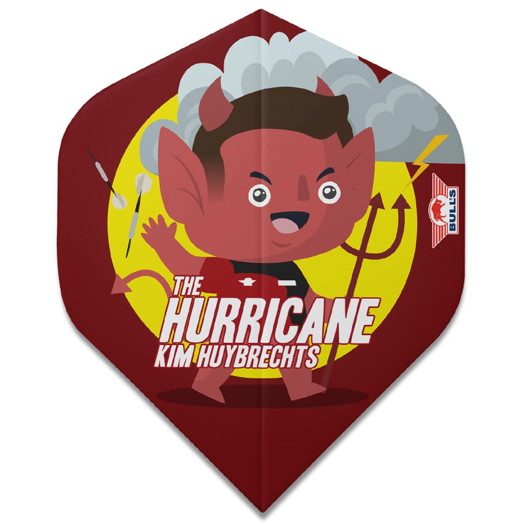 Die starke Bull’s Player 100 Kim Huybrechts Cartoon No.2 Flight wurde für den Bull’s Spieler Kim Huybrechts „The Hurricane“ entwickelt. Auf der Flight ist ein kleiner roter Teufel in einem Wirbelsturm abgebildet. In diesem Wirbelsturm fliegen Kims Darts herum. Mit dieser Flight verursachen Sie zwar keinen Orkan, aber Sie können damit fantastische Darts werfen. Die Flight ist 100 Mikron stark und hat die Standardform Nr. 2