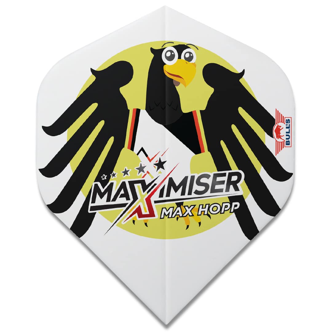 Der starke Bull’s Player 100 Max Hopp Cartoon No.2 Flight, entworfen für den Bull’s Spieler Max Hopp – The Maximiser. Der Flight zeigt einen deutschen Adler mit Max‘ Trikot. Im Wirbelwind fliegen seine Darts umher. Der Flight gleitet wie ein Adler, besteht aus 100 Mikron starkem Material und hat die Standardform Nr. 2.
