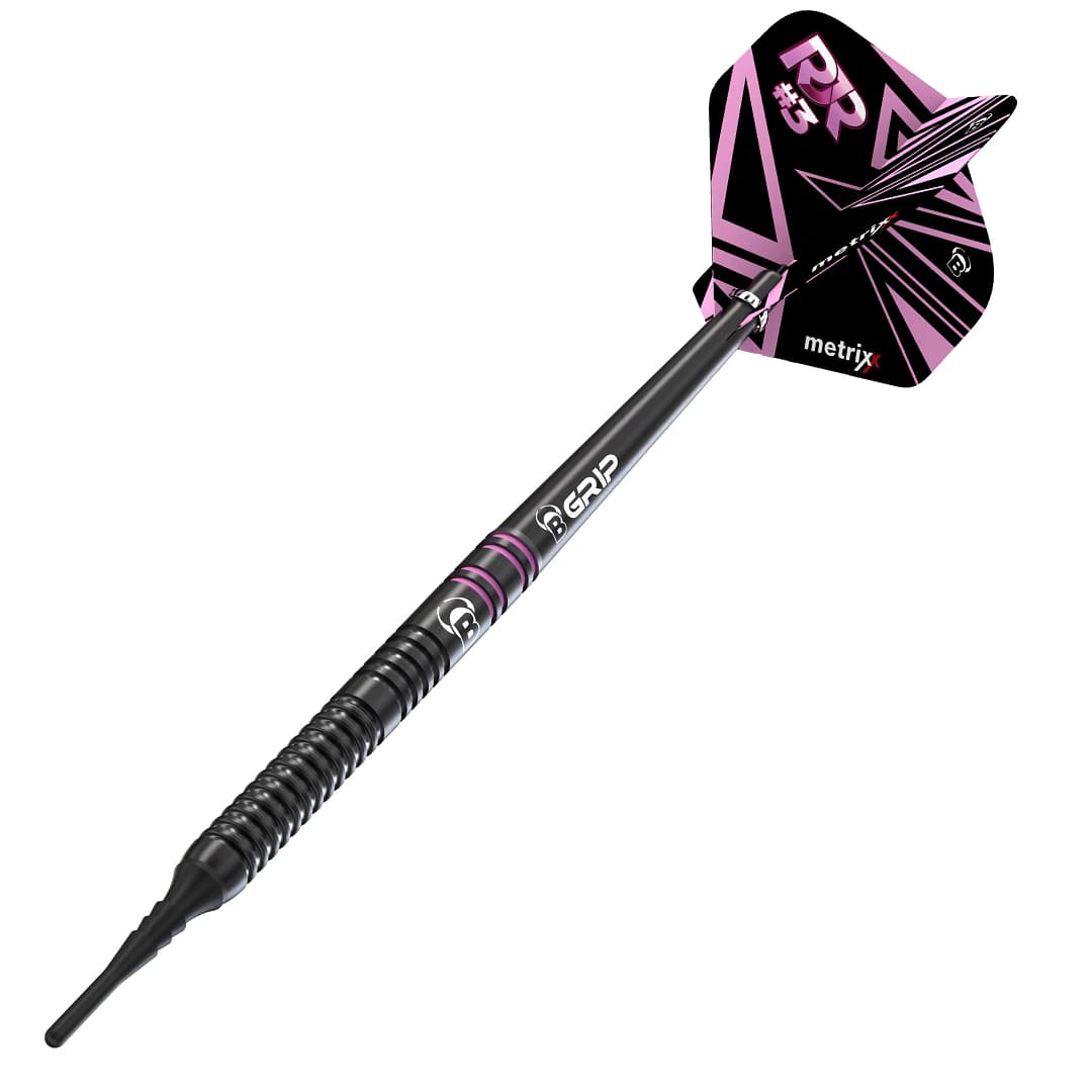 Ein feiner 90 % Tungsten Dart mit einer schwarzen Titanium Beschichtung. Rusty-Jake Rodriguez hat sich bei seinem Dart für unterschiedliche Gripzonen entschieden, die optimal an seinen Wurfstil angepasst sind. Der schwarze B-Grip-2 Shaft und sein RJR#3 metrixx Flight runden den Dart stilvoll ab. Rusty-Jake spielte bereits als dreijähriger zusammen mit seinen größeren Brüdern Dart und wurde bereits 2017 Profi. Rusty-Jake ist dadurch trotz seines jungen Alters bereits seit Jahren eine feste Größe auf den großen Dartbühnen dieser Welt.