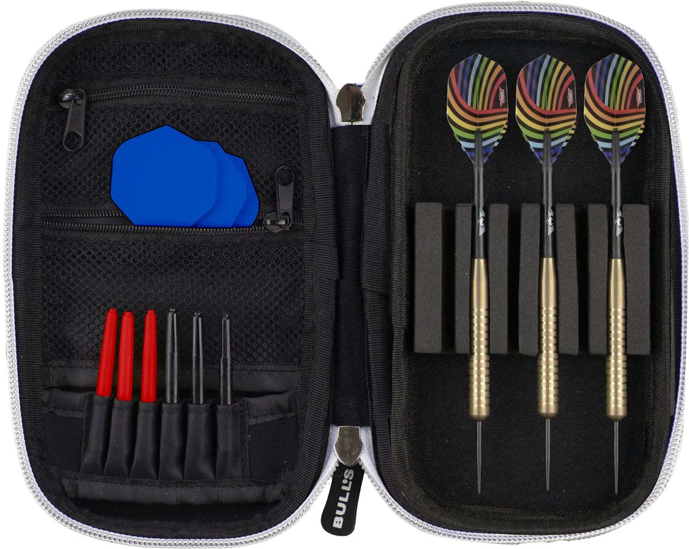 Hier kommt das Bull’s Wings Case Small ins Spiel. Dieses kompakte Etui bietet Platz für Ihr Lieblings-Dartset und zusätzlichen Stauraum für sämtliches Zubehör. Schaumstoffeinlagen halten Ihre Flights sicher fest, während die andere Seite des Etuis Halterungen für Ihre Schäfte bietet. Zusätzlich gibt es mehrere Reißverschlusstaschen für weitere wichtige Utensilien wie Schleifsteine. Das Etui ist robust gebaut und hält auch rauer Behandlung stand. So sind Ihre Darts immer sicher und einsatzbereit!