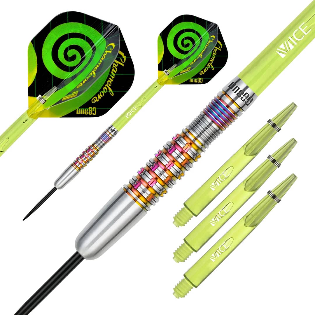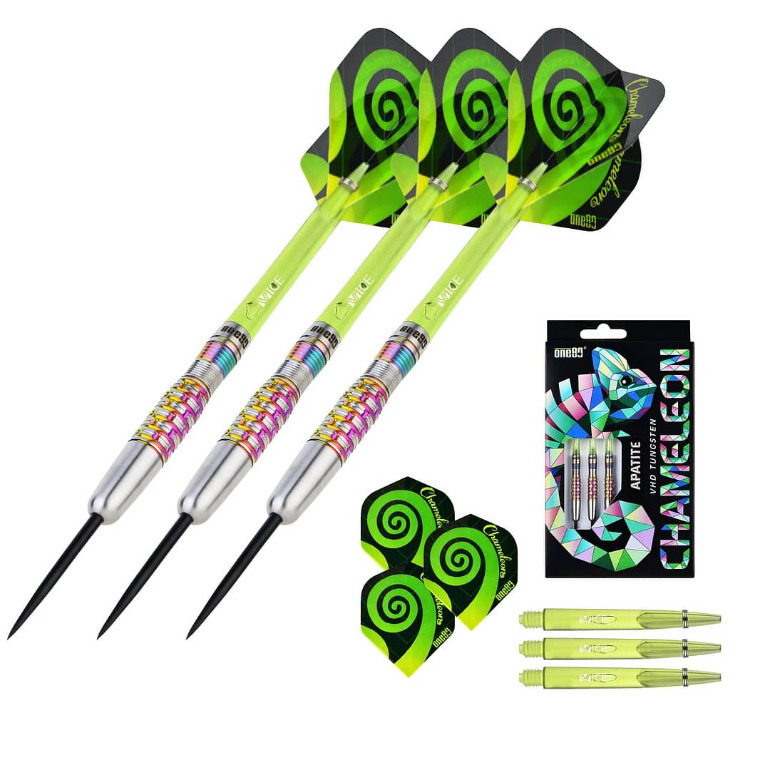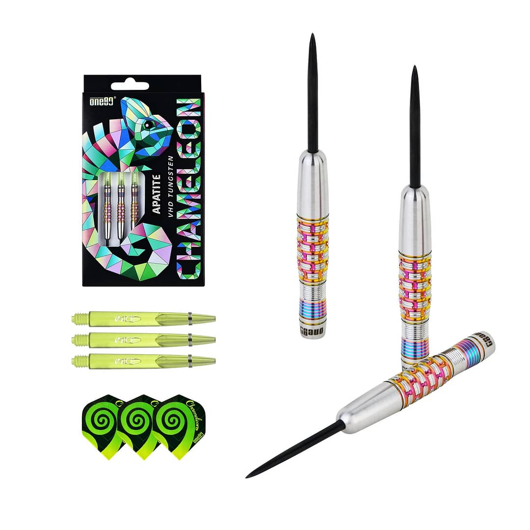 Einzigartige DNA-Beschichtung und eine Vielzahl von Dartformen und Grip-Typen, das zeichnet die Chameleons aus. So auch beim Apatite. Dieser Dart bringt dem Spieler eine ruhige Flugbahn durch seine leicht kopflastige Form und eine Gripmischung aus Doppelringgrip mit Axialrillen, welche versetzt eingefräst wurden, und einem feinen Ringgrip zum Ende des Darts.
