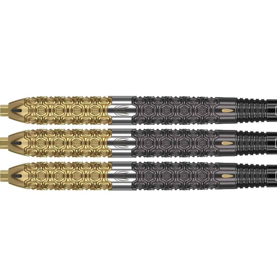 Der von Elysia inspirierte Griff verfügt über eine unverwechselbare schwarz-goldene Leistungsbeschichtung, die eine Reihe von Zellen für eine starke und dennoch subtile Griffstruktur enthält. Die atemberaubenden Barrels gehen in die leistungsstarken Pro Grip EVO-Schäfte über, die mit tiefgrünen Akzenten versehen sind und einen ganz besonderen Look für einen kompletten Dart bieten, der von einer luxuriösen Lifestyle-Ästhetik inspiriert ist. Die geraden Barrels sind mit goldenen Swiss Points versehen, den patentierten austauschbaren Spitzen von Target, die einen wirklich individuellen Dart ermöglichen.