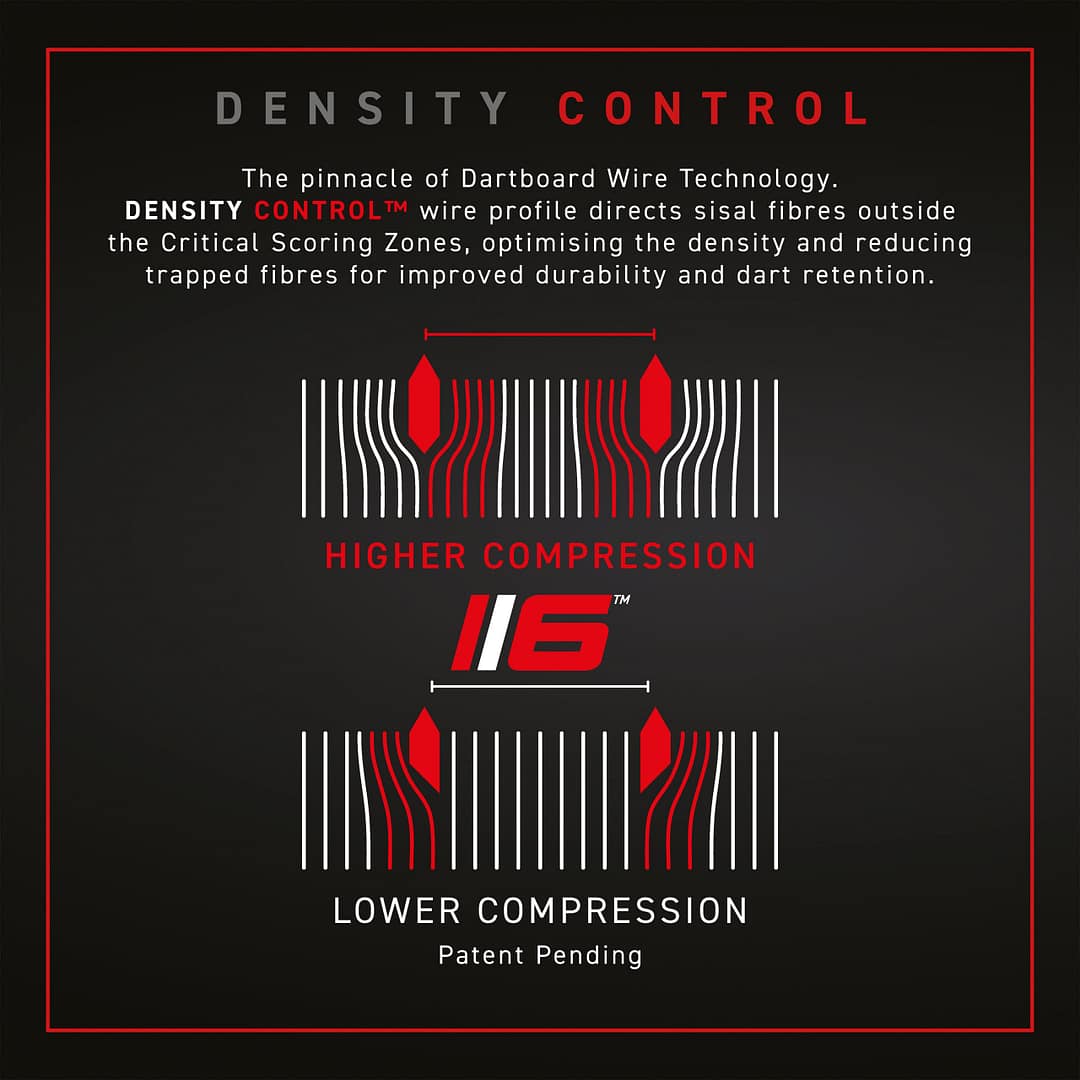 Der ultradünne, um 60° abgewinkelte Draht lenkt die Darts in den Scoring-Bereich und minimiert so Abpraller. Das vollständig gehärtete Bullseye und das äußere Bullseye, beide mit „Density Control™“-Draht, sind jetzt 25 % dünner.