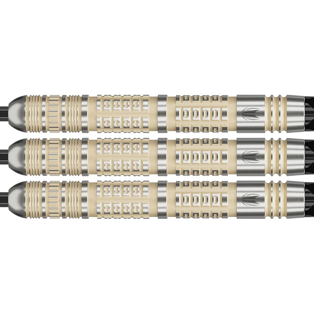 Das Dimitri Van den Bergh 95K SP Barrel mit geradem Profil ist aus 95% Tungsten gefertigt und für gleichmäßige Würfe optimal ausgewogen. Der kleine vordere Abschnitt ist mit feinen Ringen für einen vorne gewichteten Griff überzogen. Der mittlere Teil geht in ein präzise gefrästes Karomuster über, das einen überaus gleichmäßigen Griff ermöglicht. Mit seiner sandgestrahlten Oberfläche und schützenden Zirconium-PVD-Beschichtung bietet das Barrel Langlebigkeit und eine einzigartige, moderne Optik.