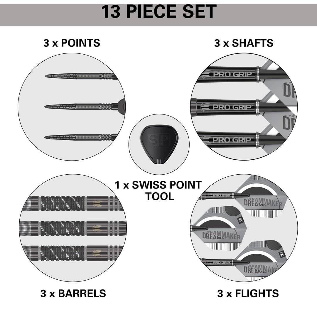 Profitieren Sie von der Swiss Point Dart Technologie mit der 26mm Black Swiss Point, die ein patentiertes Verriegelungssystem für einen einfachen Wechsel der Spitze mit dem mitgelieferten Swiss Point Tool bietet. Die Konus- und Gewindetechnologie sorgt für Stabilität und schnelles Entfernen von abgebrochenen Spitzen während des Spiels.
