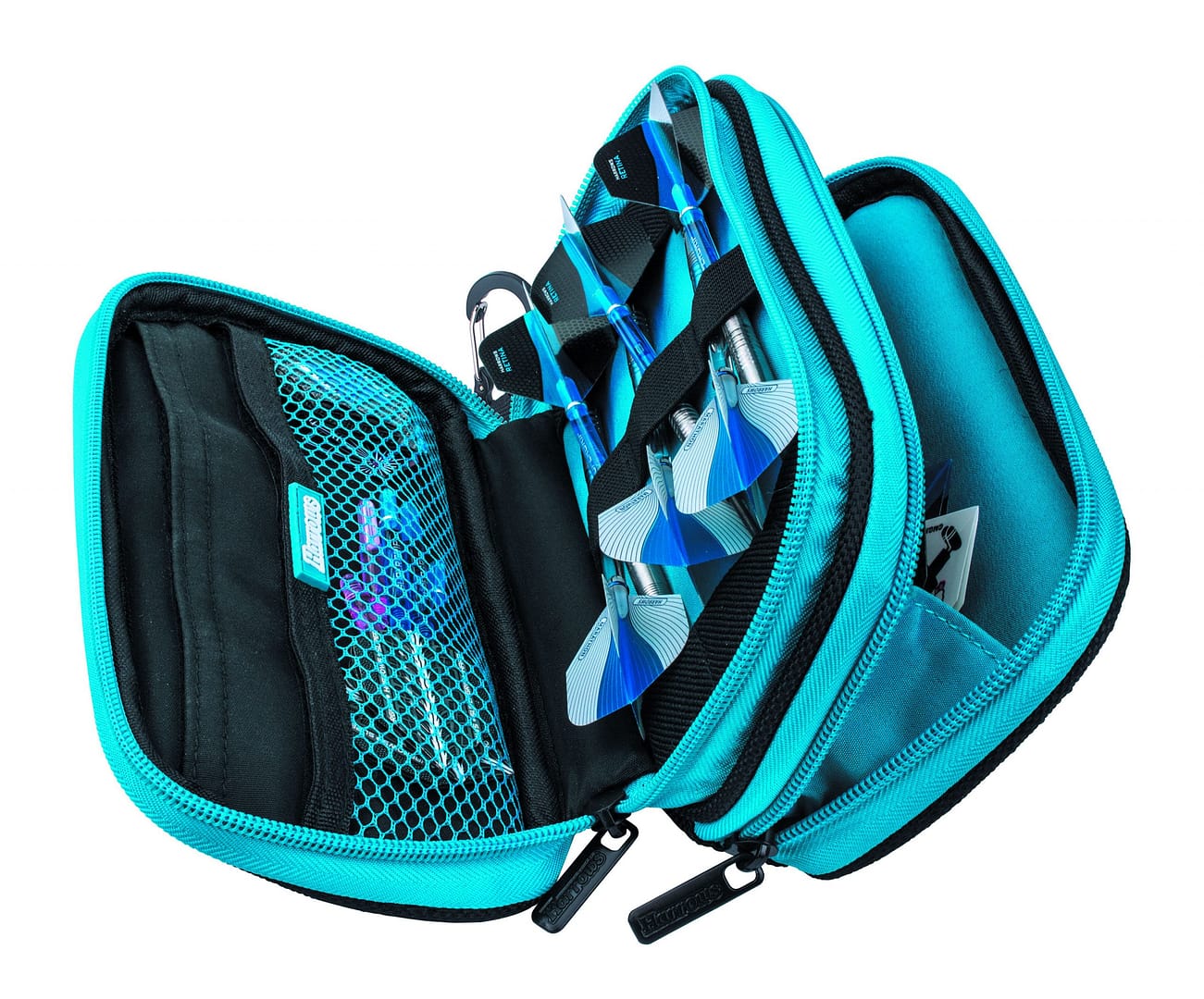 Kompakte Darttasche für 1 oder 2 Set Darts, mit vielen Fächern für Dartzubehör oder Sonstiges.