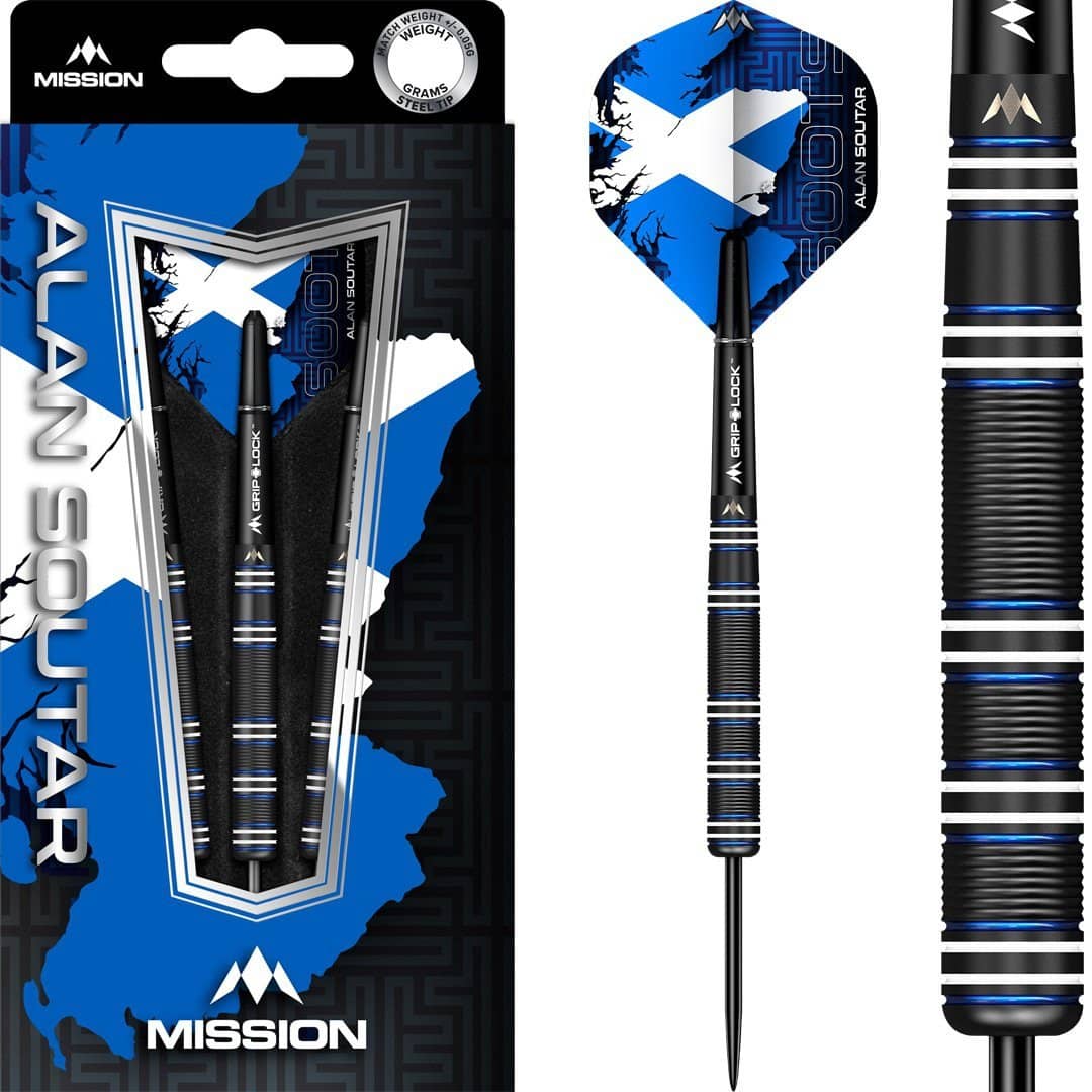 Die Mission Alan Soutar Black Titanium Players Darts verfügen über ein gerades Barrel-Design und eine Bullnose mit schwarzer PVD-Beschichtung mit blauen und weißen Highlights.