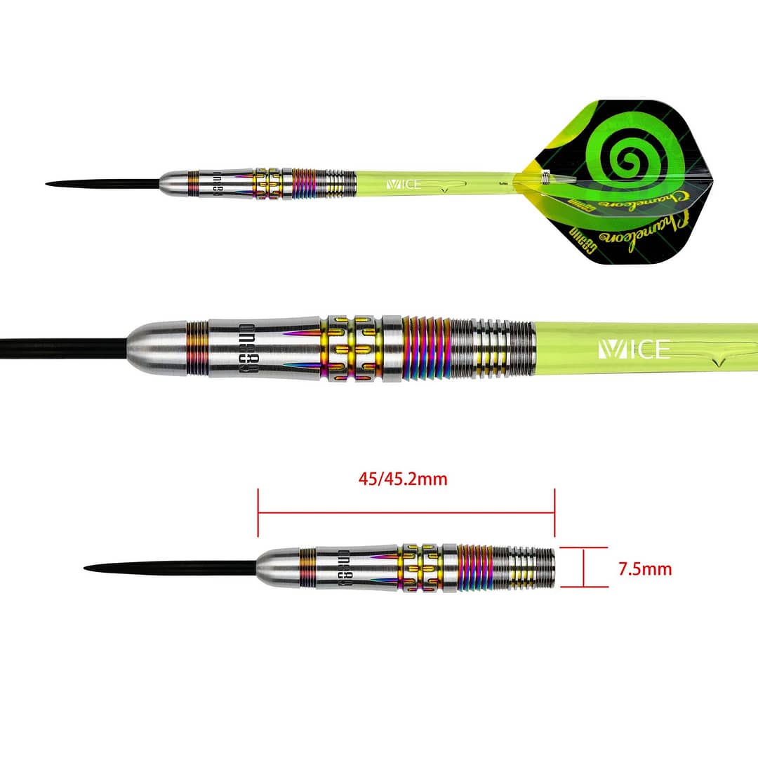 Alle  Modelle der Chameleon Serie wurden mit einem mehrfarbigen Rainbow Coating beschichtet und aus 90%igen Tungsten gefertigt. Neben dem Aussehen ist auch jedes der verschiedenen Gripmuster außergewöhnlich gestaltet.