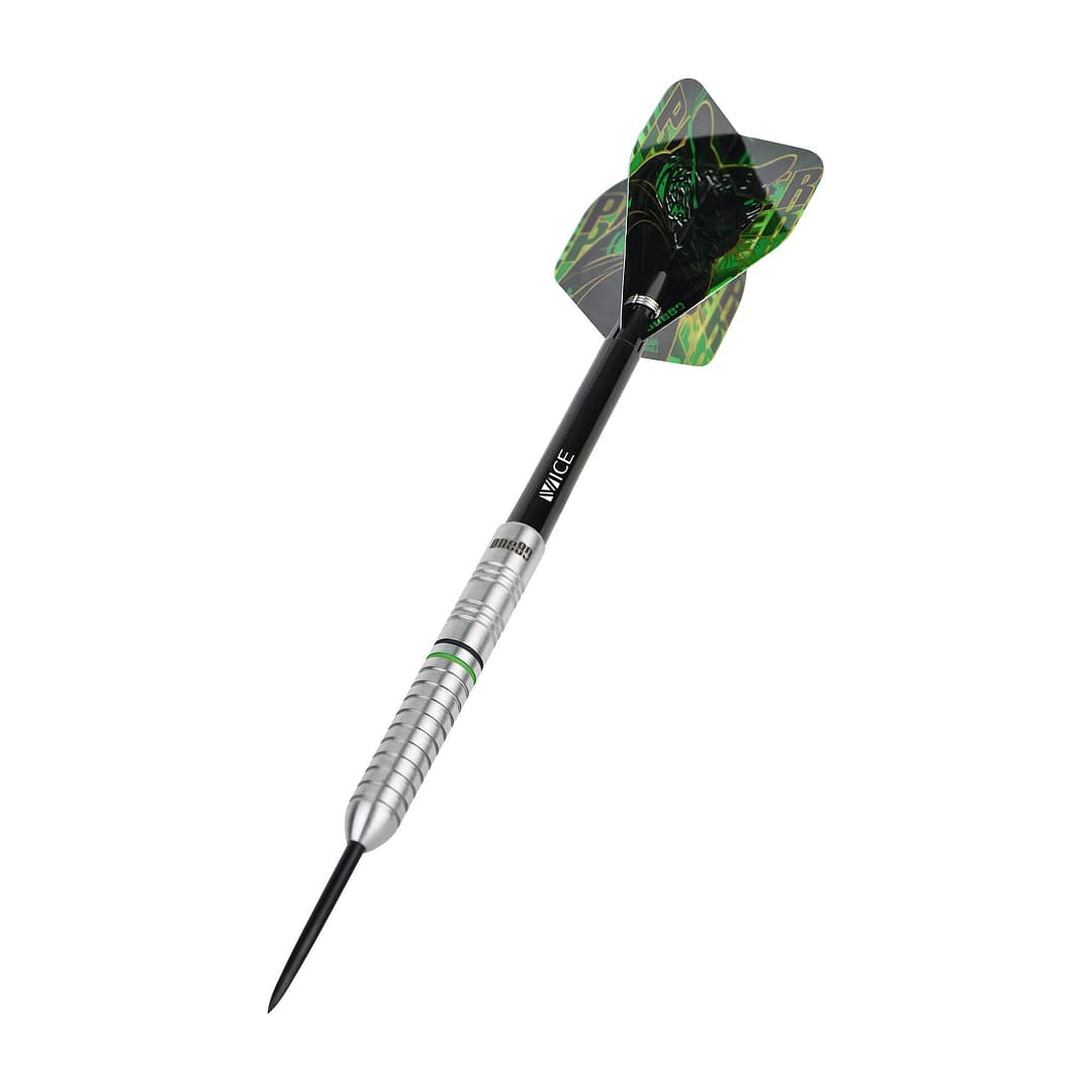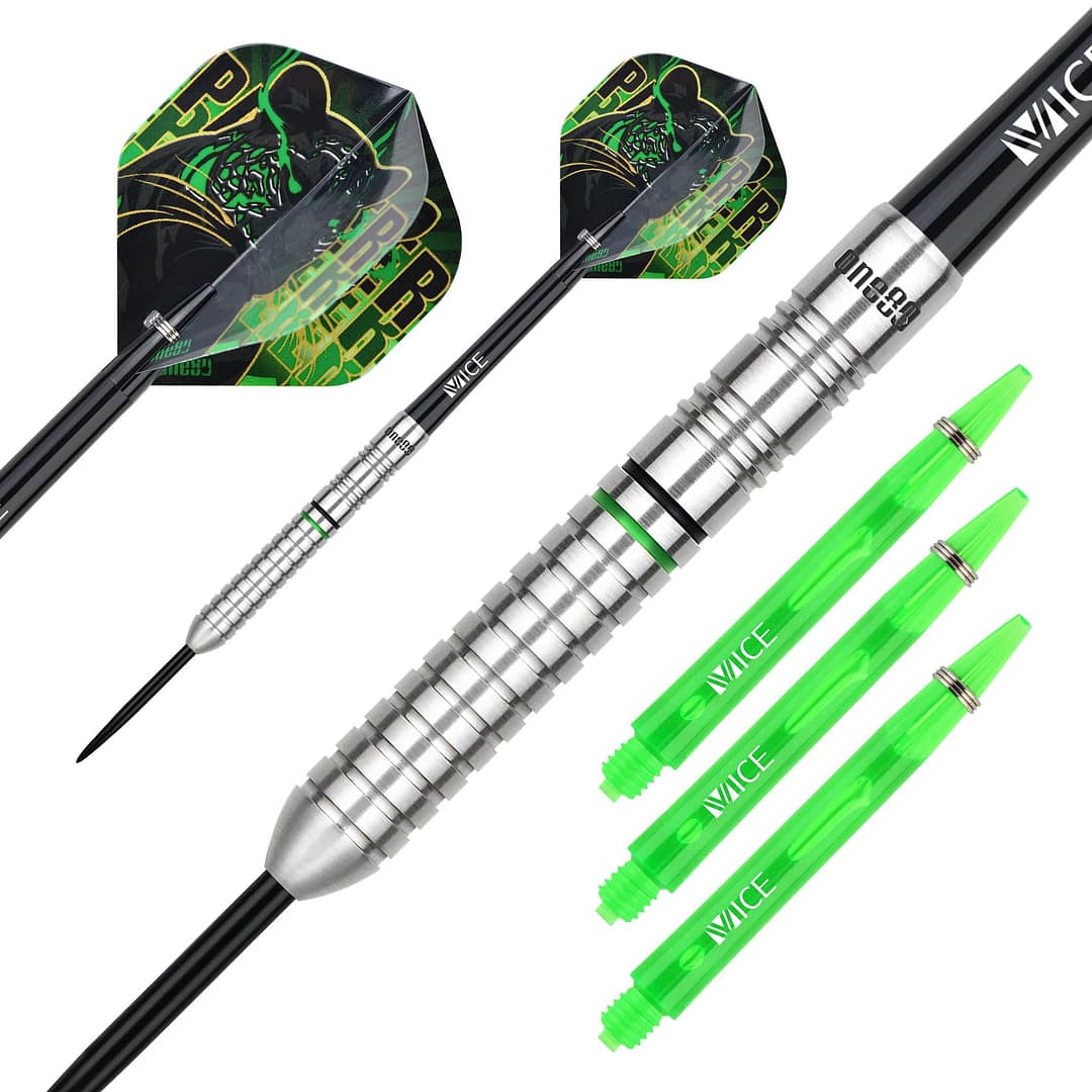 Die schwarz-grün hervorgehobenen Ringe binden den 100-Mikron-Flight ein. Packungsinhalt: ONE80 Panther-N Steeltip Barrels aus 80 % Wolfram, One80 VICE-Schäfte und 100-Mikron-Panther-Flights.