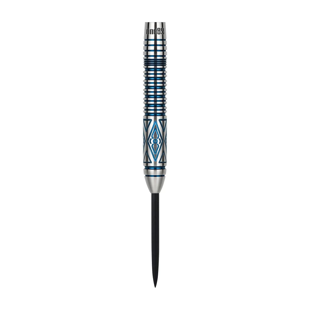 Die One80 RJ Escaros Signature Dart Steeltip haben einen 90% Tungstenbarrel, der aufwendig gefertigte Barrel ist mit einem Ringgrip versehen. Auf den in blau und silber gehaltenen Barrel ist das Logo von ONE80 gelasert.