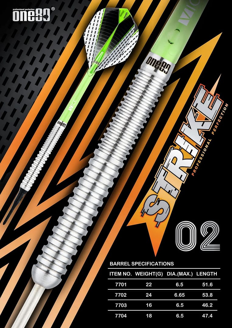 Die ONE80 – Strike 02 – Softdart Darts haben einen 80%igen Tungsten Anteil und sind hochwertig verarbeitet. Im Lieferumfang sind Flights und Schäfte mit enthalten.