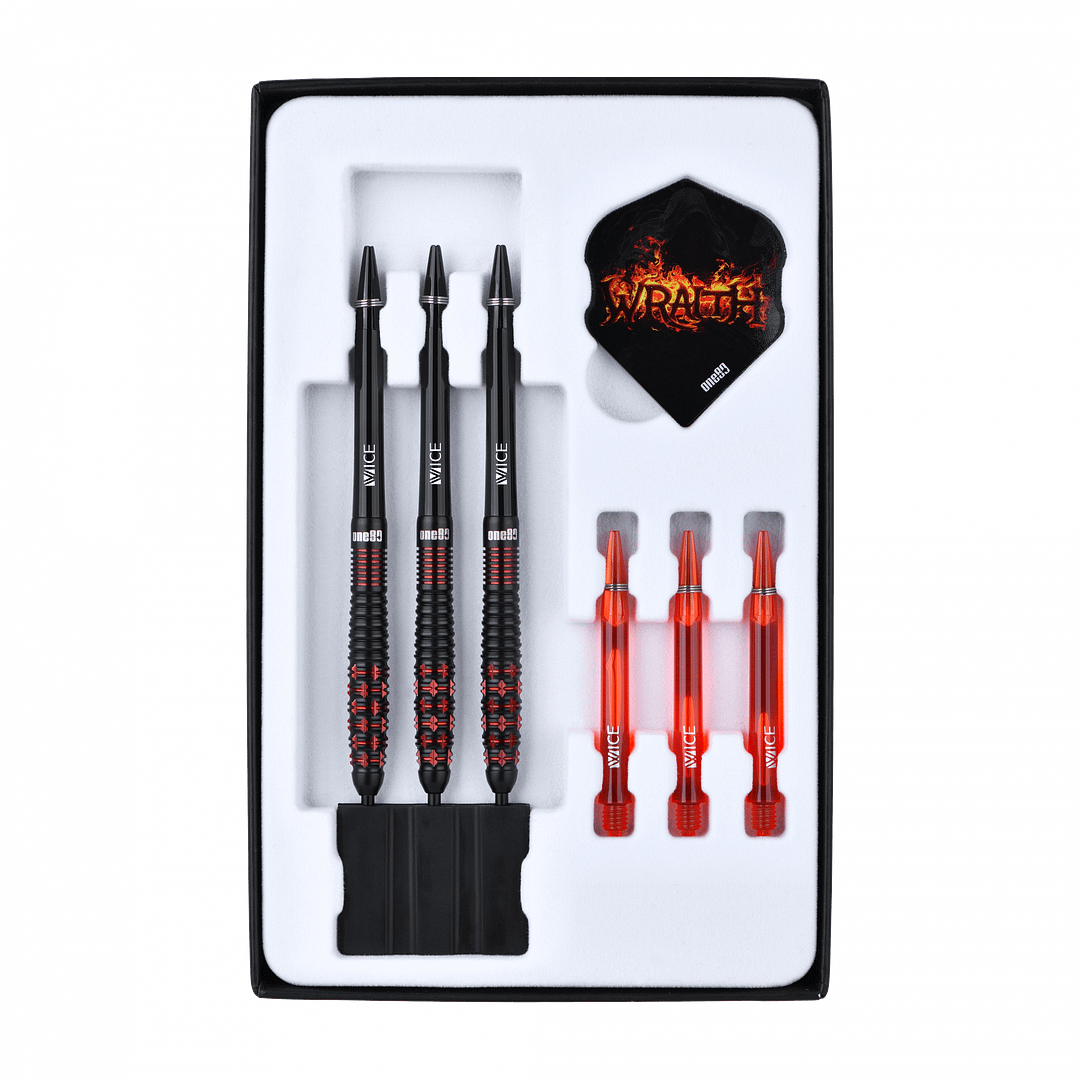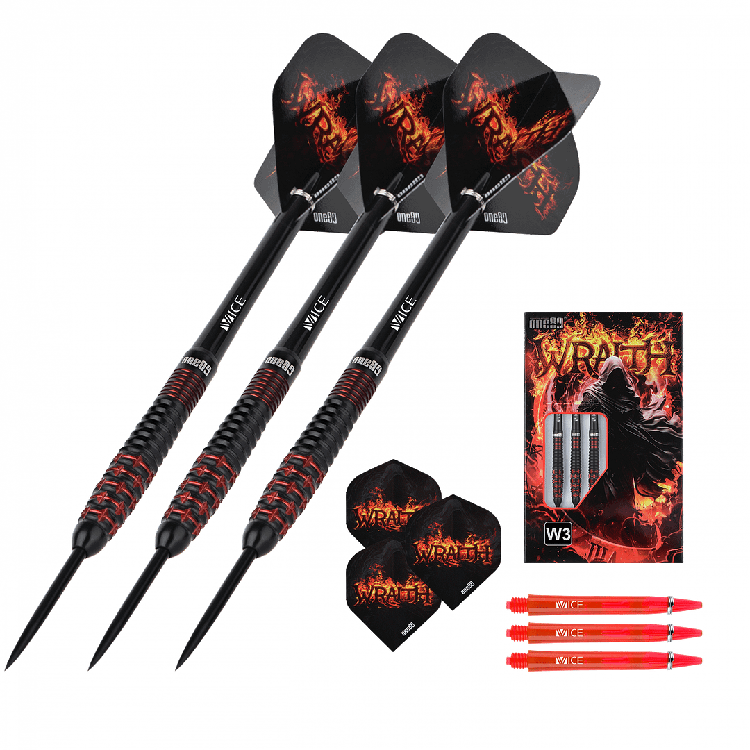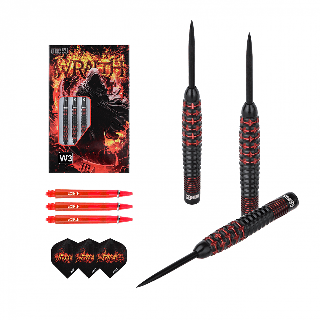 - Die nach hinten konisch zulaufenden ONE80 Wraith W3 Steeltip Barrels wurden in drei Gripzonen unterteilt und mit einem Präzisions Ringed & Shark Grip, zusätzlich mit vertikalen Fräsungen versehen