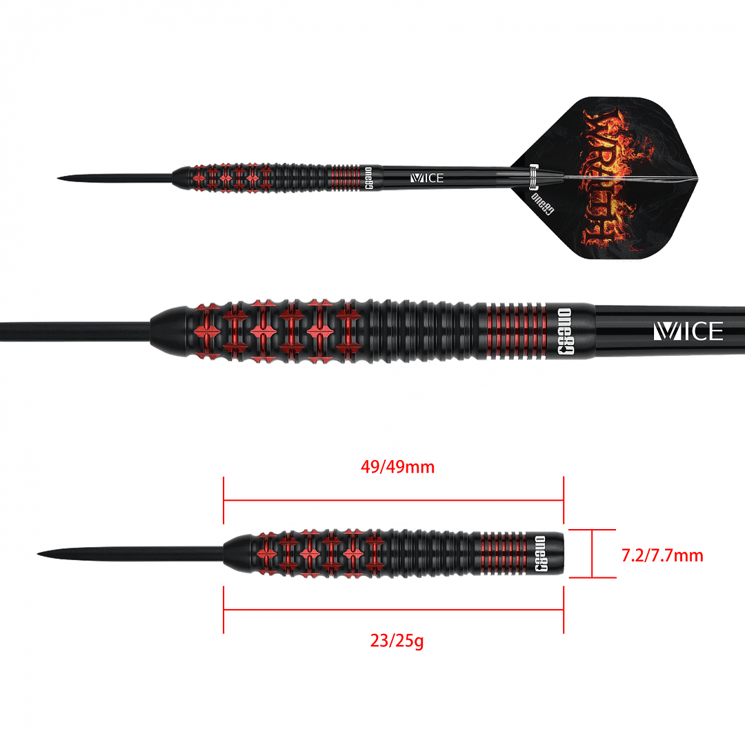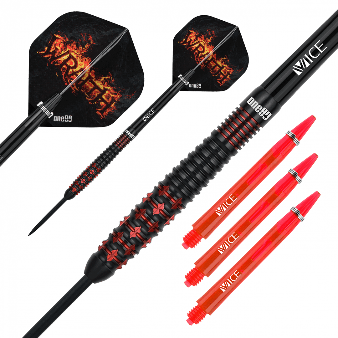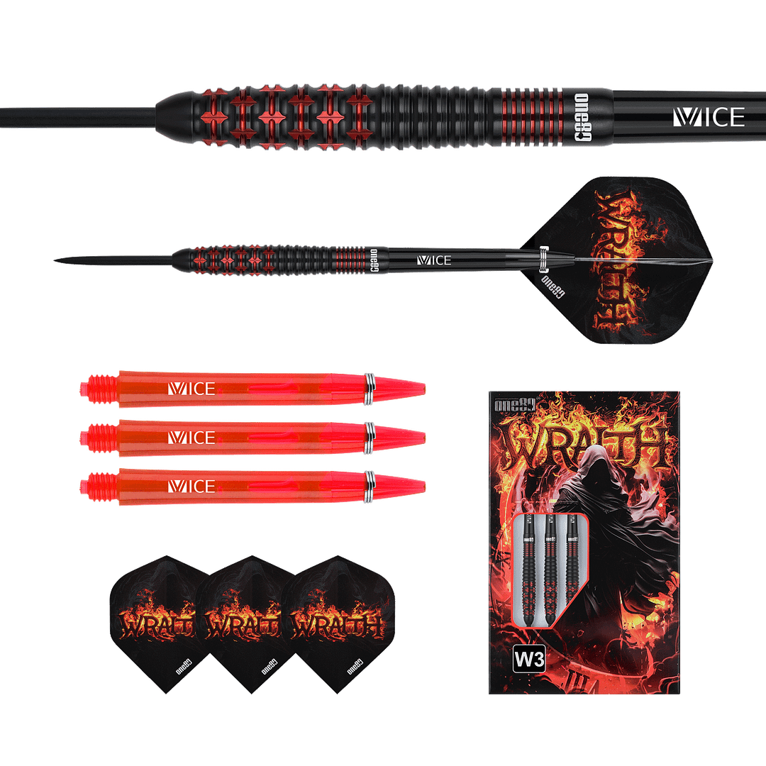 - Die nach hinten konisch zulaufenden ONE80 Wraith W3 Steeltip Barrels wurden in drei Gripzonen unterteilt und mit einem Präzisions Ringed & Shark Grip, zusätzlich mit vertikalen Fräsungen versehen