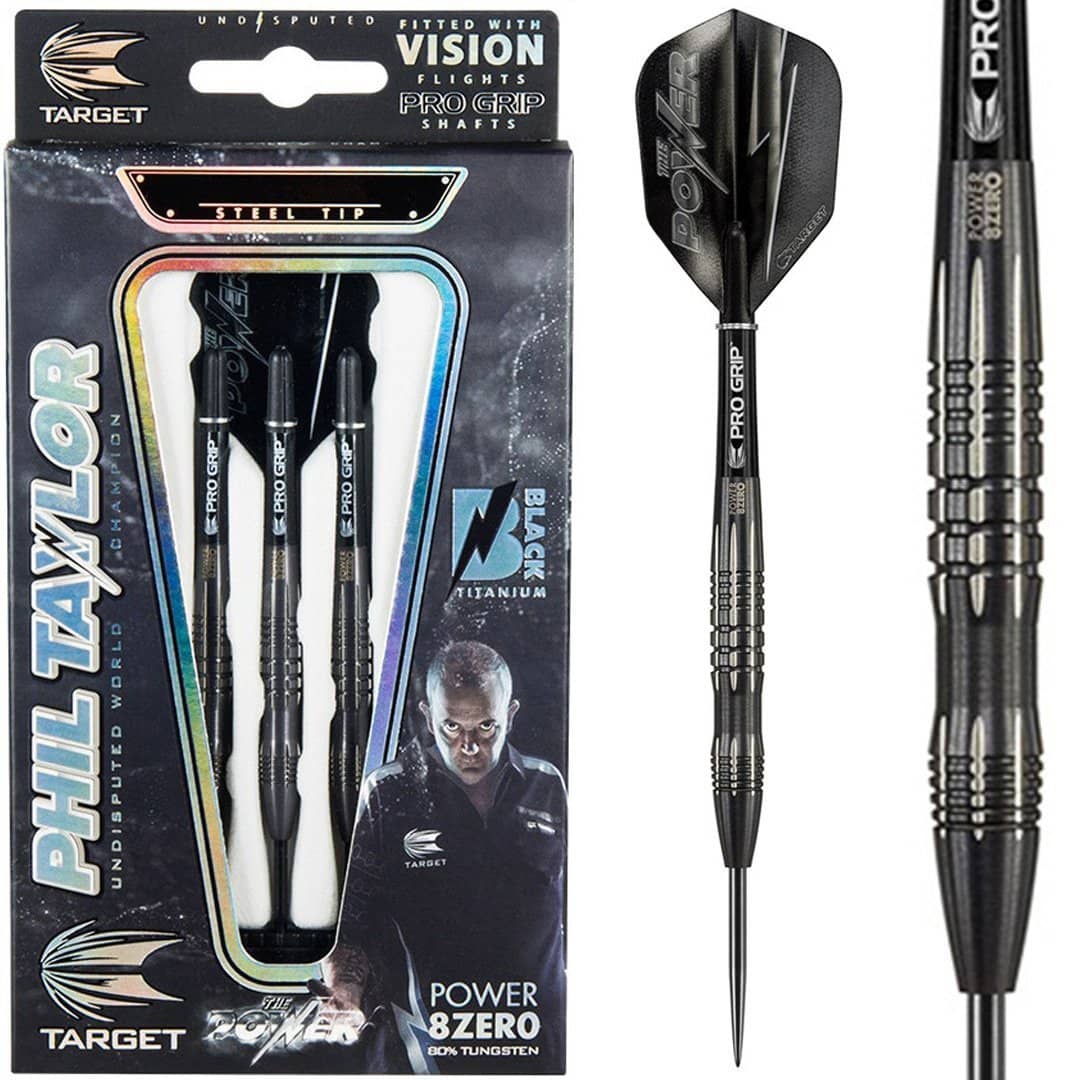 Die Phil Taylor Power 8-Zero Black P8Z3 Steeldarts wurden in Zusammenarbeit mit dem 16-fachen Weltmeister „The Power“ entwickelt. Der Barrel besteht zu 80% aus Tungsten und und wird mit einer japanischen CNC-Drehmaschine manuell gefräst. Der Dart ist mit einer schwarzen Titan-Nitrid-Beschichtung versehen, die anschließend nachbearbeitet und gelasert wurde, um einen komplexen, detaillierten Grip zu erzeugen.