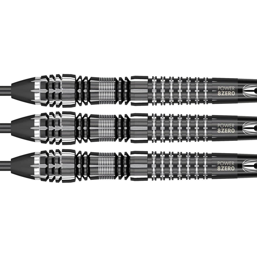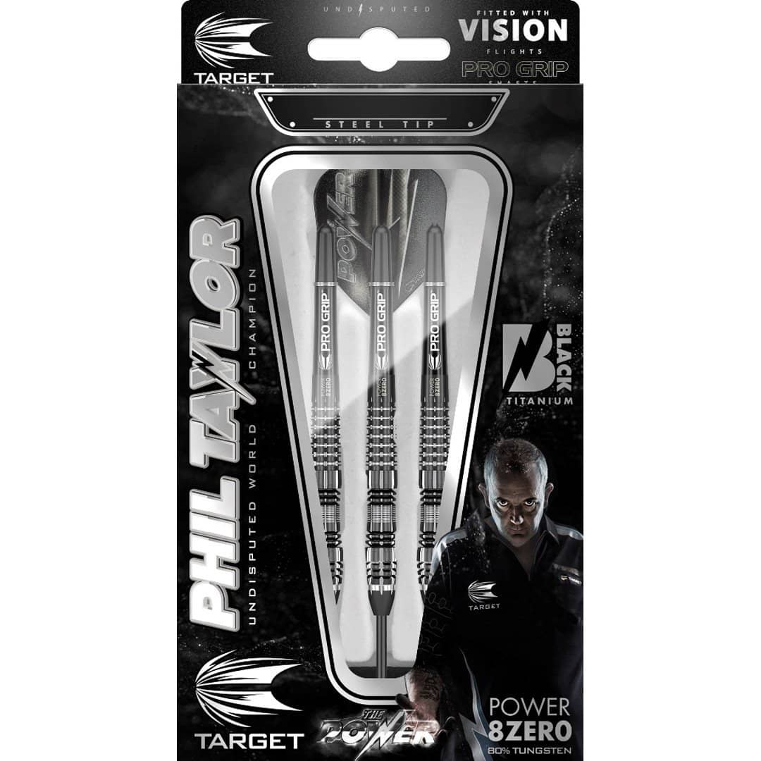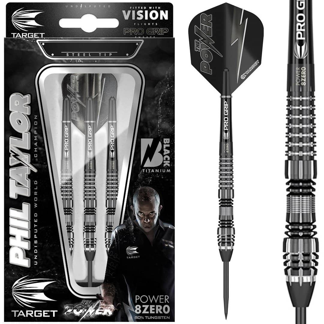 Die Phil Taylor Power 8-Zero Black P8Z4 Steeldarts wurden in Zusammenarbeit mit dem 16-fachen Weltmeister „The Power“ entwickelt. Der Barrel besteht zu 80% aus Tungsten und und wird mit einer japanischen CNC-Drehmaschine manuell gefräst. Der Dart ist mit einer schwarzen Titan-Nitrid-Beschichtung versehen, die anschließend nachbearbeitet und gelasert wurde, um einen komplexen, detaillierten Grip zu erzeugen.
