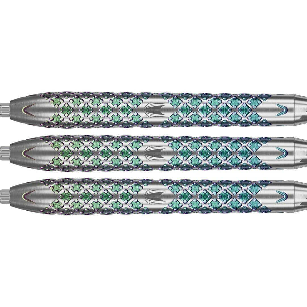 Die Rove 03 SP 90% Tungsten Barrels verfügen über eine Präzisionsfräsung und sind mit einem auffälligen grünen diamantähnlichen Carbon-Finish beschichtet. Die detaillierte Textur und die Designelemente bieten einen hervorragenden Grip und Kontrolle. aus, das sich zur Spitze hin verjüngt, was den Griff nach vorne unterstützt, und ein schnelles Auslösen fördert. Die verjüngte Form ermöglicht auch engere Gruppierungen auf dem Brett, ideal für Spieler, die ihr Scoring-Potenzial maximieren wollen.
