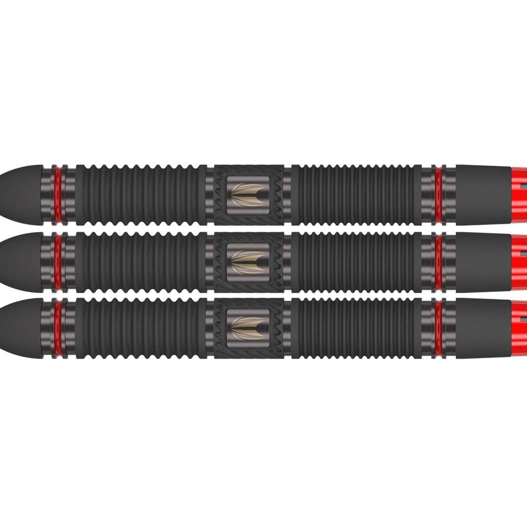Das Scope 01 SP Straight Dart Barrel ist aus 90% Tungsten gefertigt und fachmännisch mit Radialrillen auf der Vorderseite und Nanorillen auf der Rückseite gefräst, was den Grip der Darts verbessert. Der Scope 01 SP Barrel ist sandgestrahlt und mit einer glatten schwarzen PVD-Beschichtung versehen, um die Haltbarkeit zu erhöhen und ein raffiniertes, mattes Aussehen zu erzielen, wobei rote Flecken dem Barrel einen farblichen Akzent verleihen.