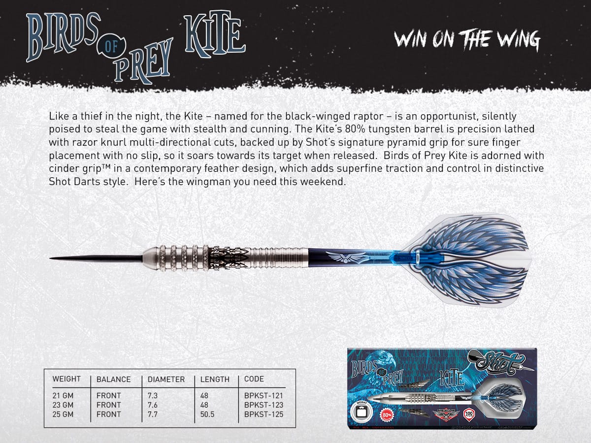 Der Shot Birds of Prey Kite – benannt nach dem schwarzgeflügelten Raubvogel – ist ein Opportunist, der mit List und List das Wild stiehlt. Der aus 80 % Wolfram bestehende Lauf des Kites ist präzisionsgedreht und mit messerscharfen Rändelschnitten in alle Richtungen versehen. Der für Shot typische Pyramidengriff sorgt für sicheren Halt und verhindert ein Verrutschen, sodass der Kite beim Abwurf seinem Ziel entgegenfliegt.