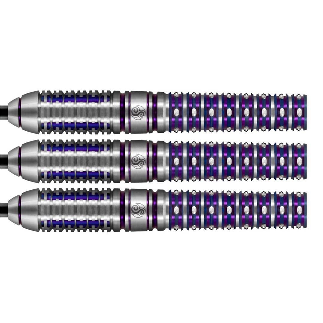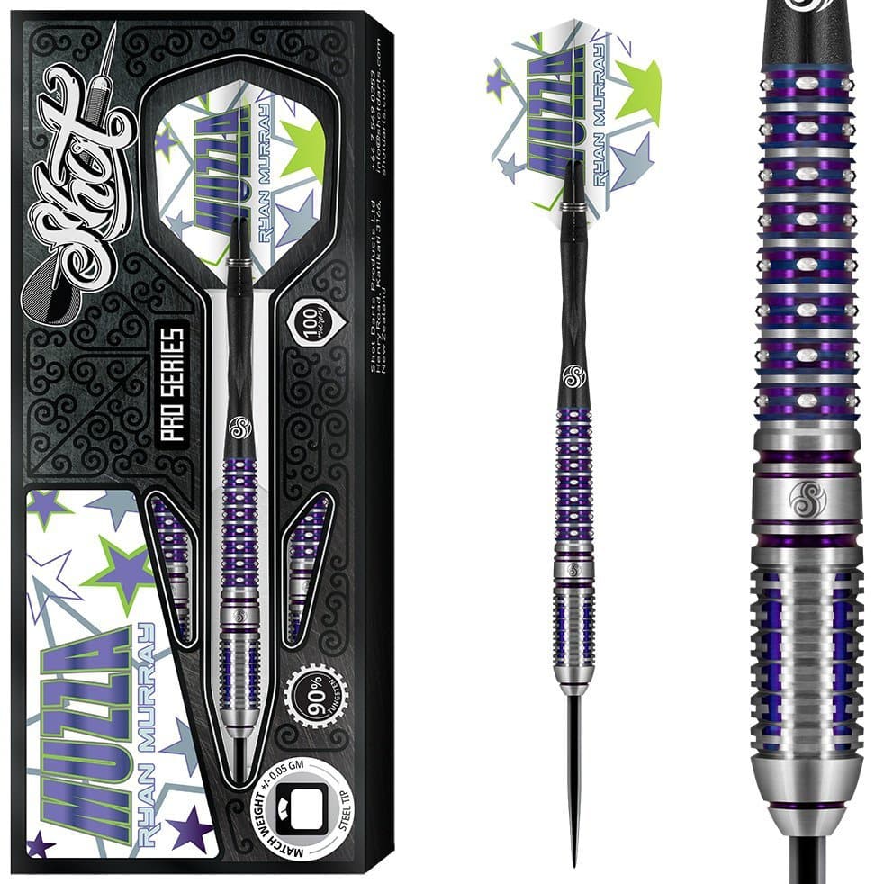 Diese luxuriöse, schwergewichtige Ergänzung der Shot Pro Dart-Serie wurde in der Shot-Werkstatt für den schottischen Dart-Profi Ryan „Muzza“ Murray entworfen und gefertigt. Dieses elegante und ausdrucksstarke Shot Pro Series Ryan Murray Dart-Design konzentriert das Gewicht vorn im Barrel und wird durch den juwelenartigen Griff hinten ausgeglichen. Mit einer brillant violetten Titanbeschichtung versehen und in Dartgewichten bis zu satten 28 Gramm erhältlich.