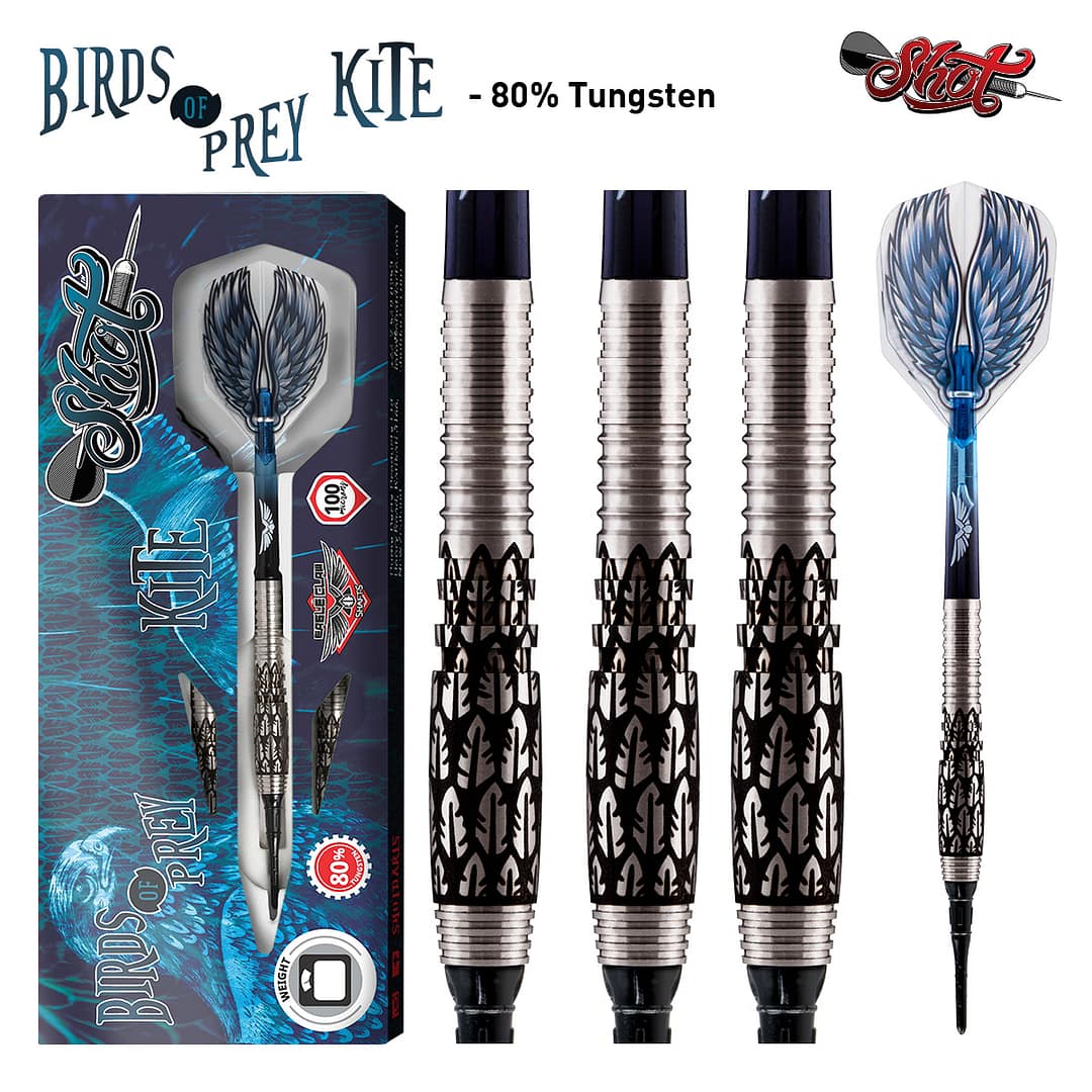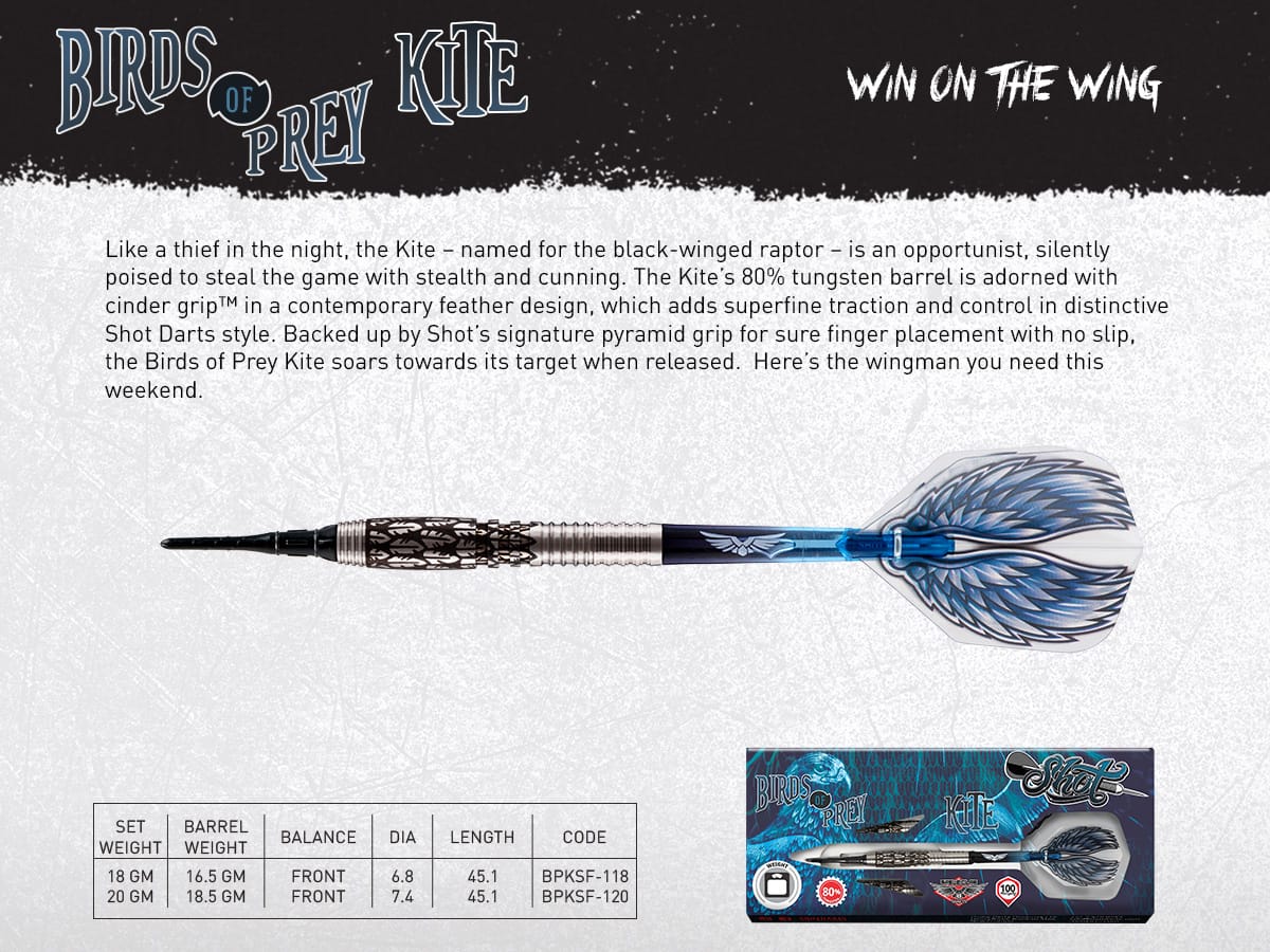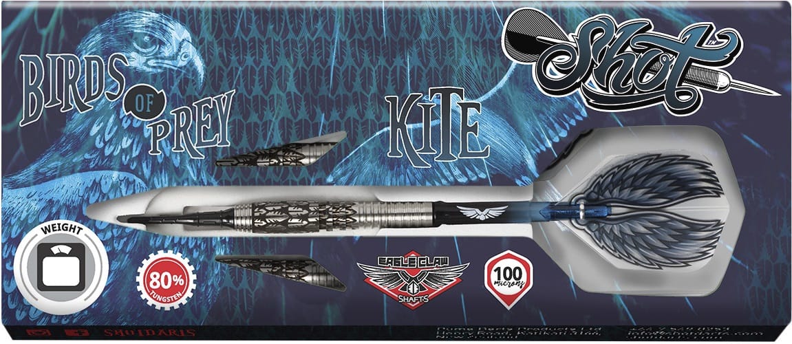 Der Shot Softtip Birds of Prey Kite – benannt nach dem schwarzgeflügelten Raubvogel – ist ein Opportunist, der mit List und List das Wild erobert. Der aus 80 % Wolfram bestehende Schaft des Kites ist mit Cinder Grip™ im modernen Federdesign versehen, das für superfeine Traktion und Kontrolle im unverwechselbaren Shot Darts-Stil sorgt.