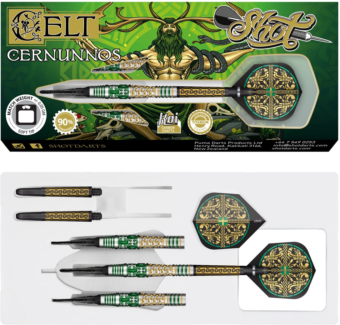 Schwing deinen Speer und zeig dein Geweih. Das Shot Softtip Celt Cernunnos Dartset fängt die Weisheit dieses Waldwächters und mystischen keltischen Gottes der Tiere und wilden, nebelverhangenen Landschaften ein.