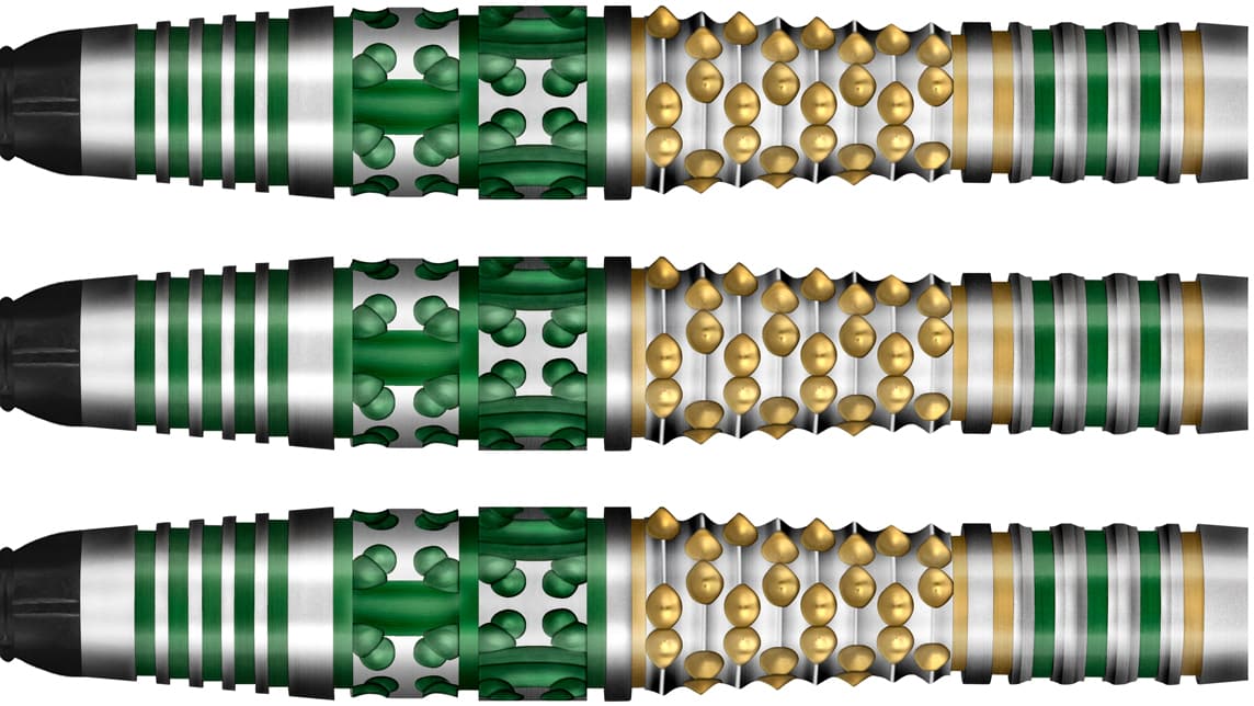 Mit seiner filigranen Textur, dem keltischen Kreuz und den wie die Rinde mächtiger Eichen geschnitzten und mit Grün und Gold beschichteten Bruyère-Griffen hilft dir dieser frontgewichtete 90%-Wolfram-Barrel, den Wald vor lauter Bäumen zu sehen.