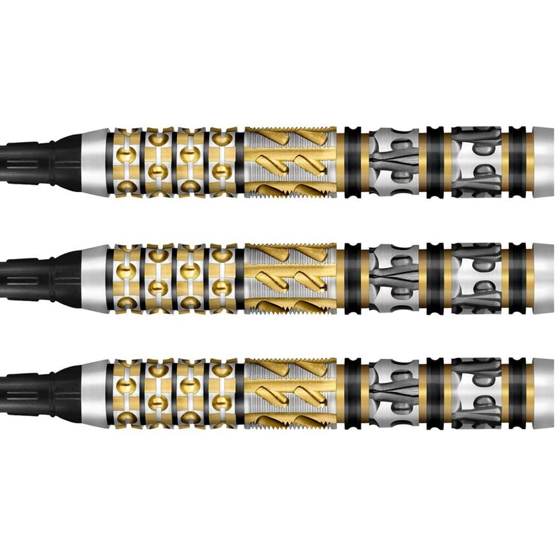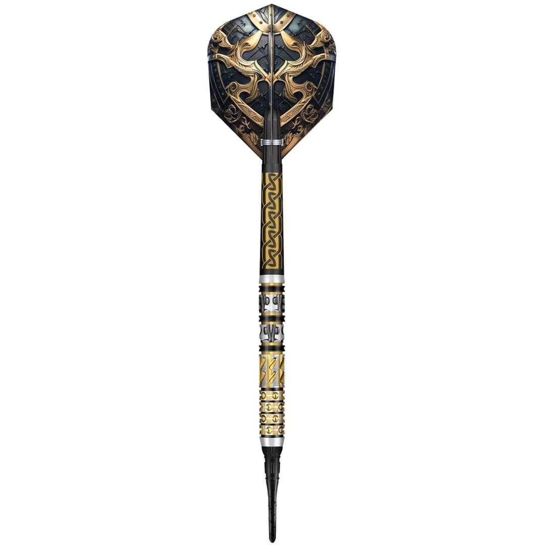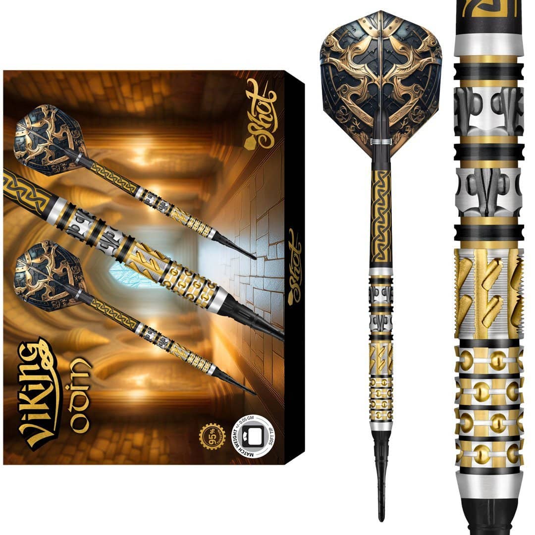 Entfesseln Sie die Kraft der nordischen Mythologie mit den Shot Softtip Viking Odin Darts. Dieses für Champions konzipierte, mittig gewichtete Shot Softtip Viking Odin Dartset mit geradem Barrel besticht durch eine robuste 95% Tungsten-Konstruktion, die Haltbarkeit und Präzision vereint. Die goldene Beschichtung, inspiriert von Wikingerschätzen, ermöglicht präzise Würfe aus jedem Griffpunkt und gibt Ihnen Kontrolle und Sicherheit auf dem Board.