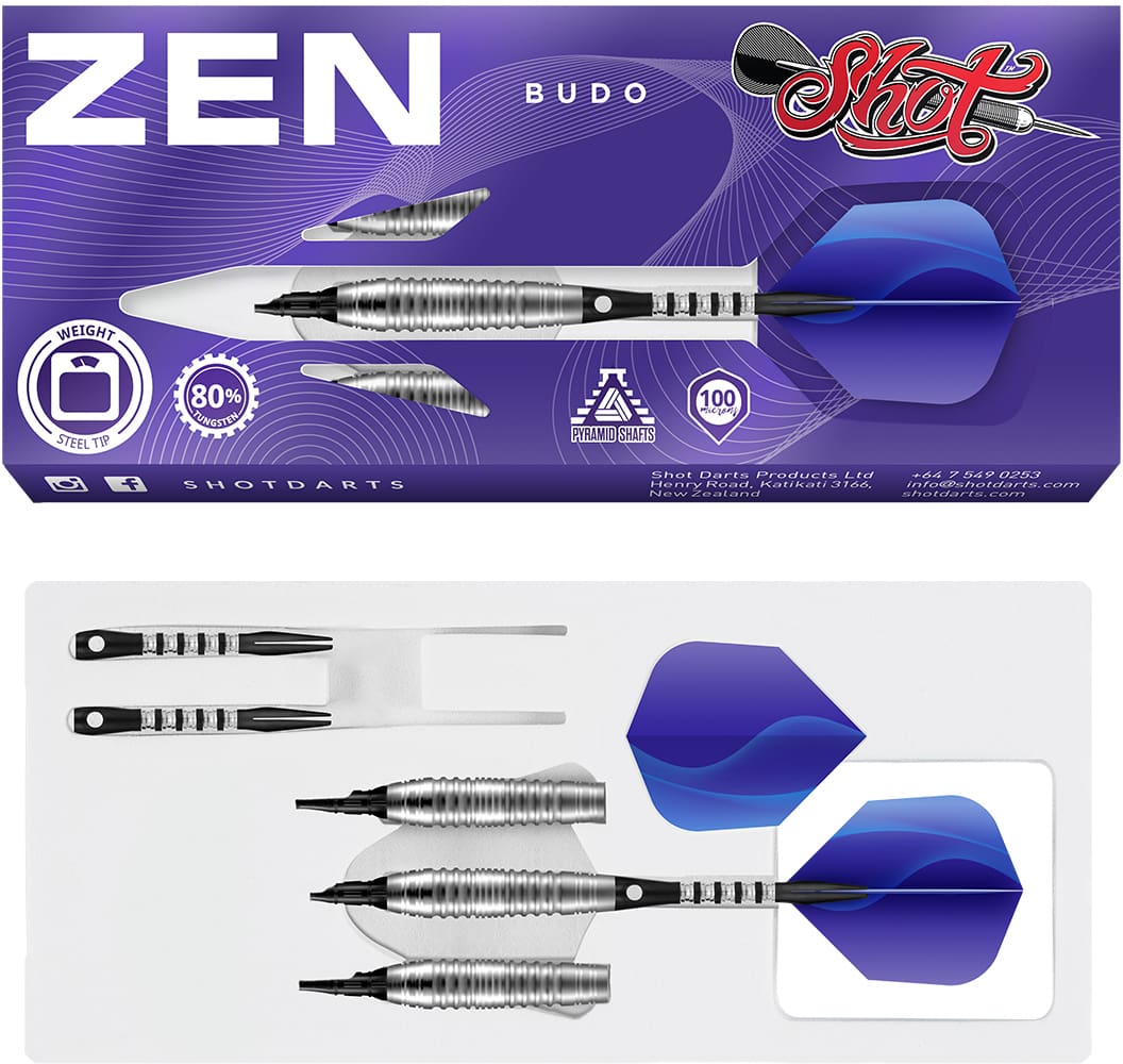 Shot Softtip Zen Budo ist eine Powerbomb mit kurzer Zündzeit – mit dem Gewicht im Schwerpunkt. Dieser robuste und kompakte Dart mit Mittelgewicht verfügt über einen stabilen Ringgriff für maximalen Abschuss und eine kurze Länge für eine stabile Flugbahn. Zen Budo ist der Barrel, den Sie brauchen, um mit vollem Selbstvertrauen in den Wettkampf zu starten.