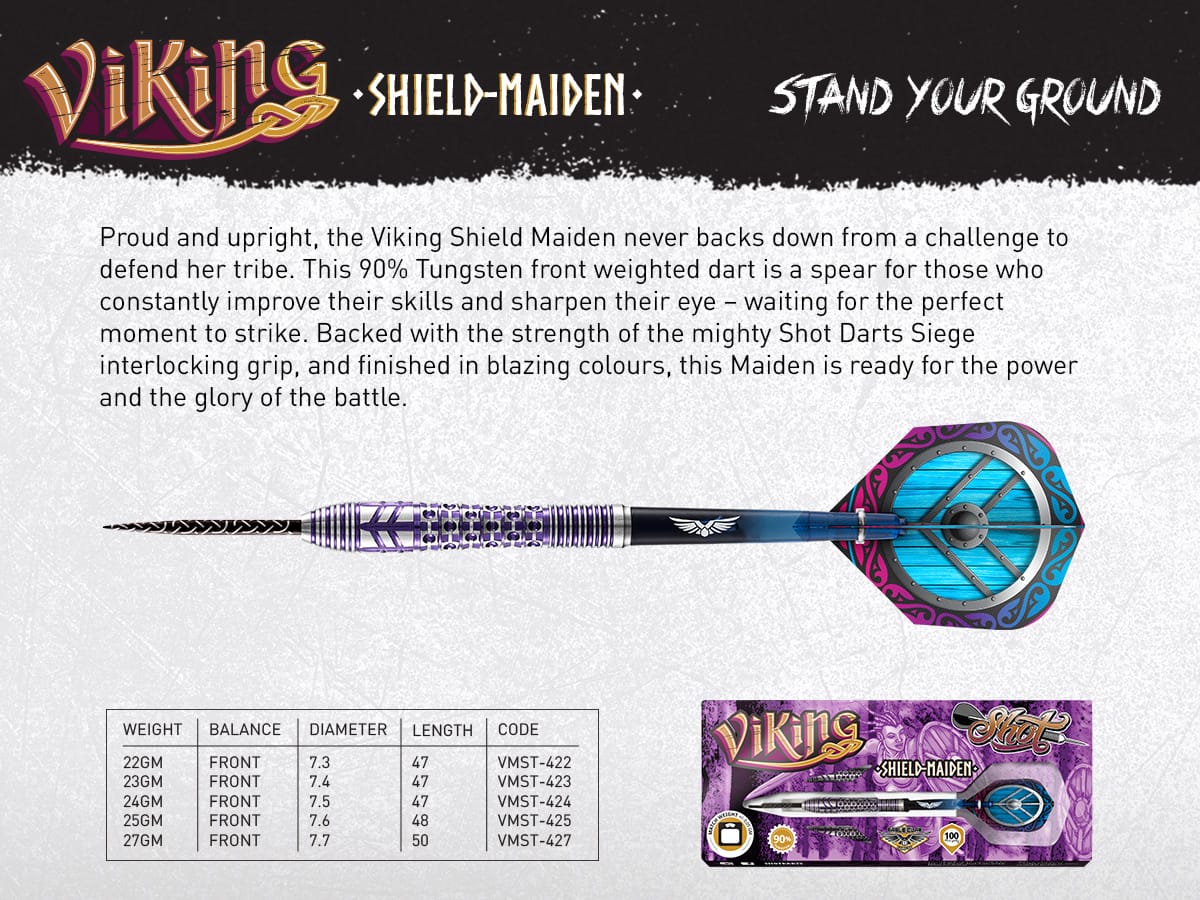 Stolz und aufrecht schreckt die Wikinger-Schildmaid vor keiner Herausforderung zurück, ihren Stamm zu verteidigen. Dieser frontgewichtete Shot Viking Shield Maiden Pfeil aus 90 % Wolfram ist ein Speer für alle, die ihre Fähigkeiten ständig verbessern und ihr Auge schärfen – und auf den perfekten Moment zum Zuschlagen warten. Mit der Kraft des mächtigen Shot Darts Siege-Verriegelungsgriffs und leuchtenden Farben ist diese Maid bereit für die Macht und den Ruhm der Schlacht.