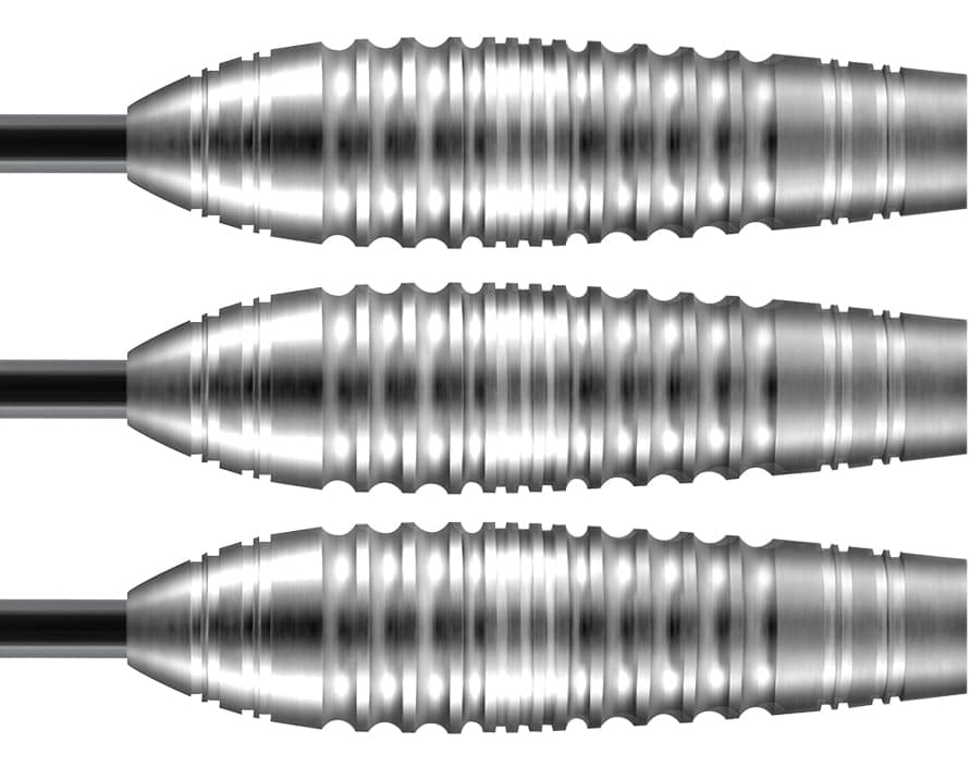 Die Spitze des bombenförmigen Budo verfügt über vier quadratische Rillen für Fingerreferenz und einen kontrollierten Abwurf. Ein klassischer, breiter Ringgriff sitzt entlang des 80% Tungsten Barrels und ist an der Rückseite mit den gleichen quadratischen Rillen versehen. Der Abstoßpunkt liegt leicht vor der Mitte. Durch die zentrale Gewichtsverteilung kann sich der wendige kleine Budo selbst korrigieren und die Dartscheibe im rechten Winkel treffen. Da er konstant geworfen werden muss, ist er der perfekte Barrel für Einsteiger.