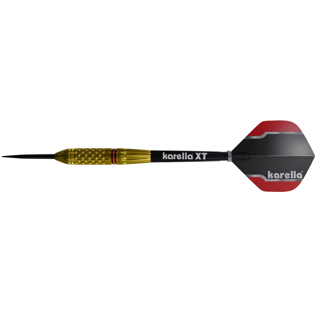 Design, Power und Qualität in einem Dart vereint. Der tropfenförmige Barrel wurde in England, dem Ursprungsland des Dartsports, aus 90% Tungsten hergestellt und durchlief mehrere ausgeklügelte Fertigungsprozesse. Designt wurde der goldene Commander erstmals in Zusammenarbeit mit der Instagram-Community von Karella. Der Meteorgrip zeichnet sich durch viele kleine tropfenförmige Einkerbungen aus und bietet ein harmonisches Griffgefühl. Ideal für die Orientierung der Finger. Perfekt für Spieler, die einen kopflastigen Dart bevorzugen und viel Wert auf ein aufwendiges Design legen. Vervollständigt wird der Dart durch die speziell entwickelten Karella XT Shafts sowie hochwertige und optisch ansprechende Karella Profi Flights. Der Steeldart Commander Gold ist in den Gewichten 22 gr. und 24 gr. erhältlich.