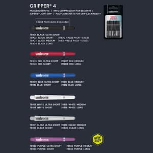 Unicorn Gripper 4 Shafts Größe Material Länge (mm) Gewicht (Gramm) Lang Nylon 47 1.18 Medium Nylon 41 1,03 Short Nylon 35 0,78 X-Short Nylon 29 0,67