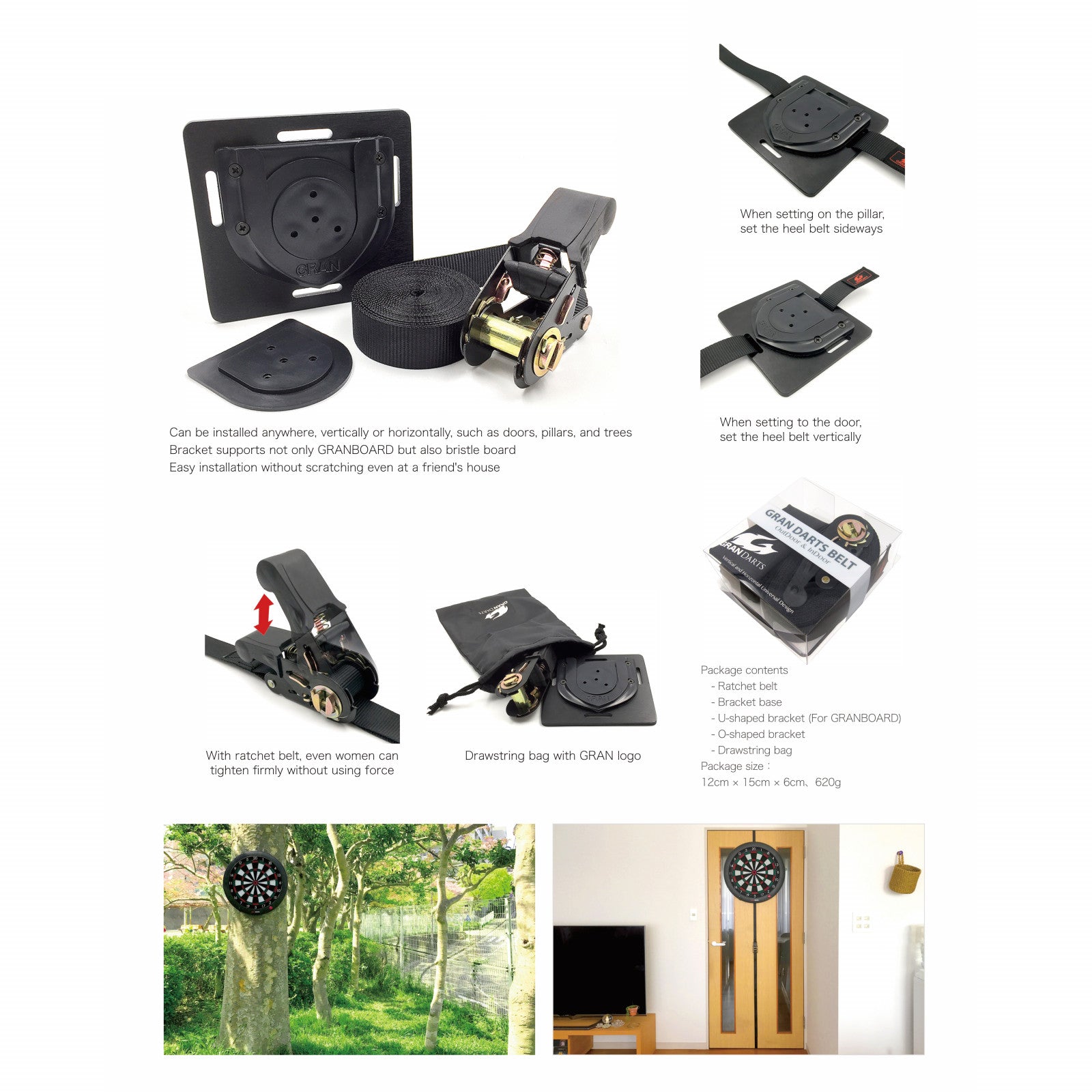 Der Gran Dart Belt ist ein Spanngurt inklusive Ratsche, der zur Montage an verschiedenen Ortenverwendet werden kann. Dieser Zurrgurt ist für alle GRANBOARD Modelle geeignet, er kann aber auch mit anderen Boards verwendet werden, die das Puck-Montagesystem verwenden können. Es kann vertikal über einer Tür oder horizontal um ein Objekt wie zu Beispiel einem Baum montiert werden.