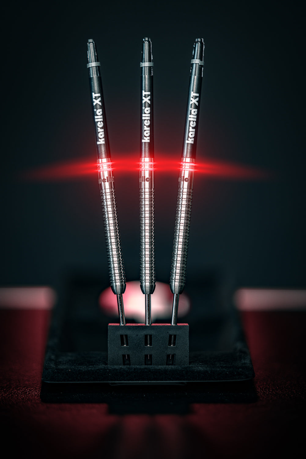 Die perfekte Gewichtsverteilung ermöglicht konstante Würfe auf höchstem Niveau. Ein Blickfang sind die beiden charakteristischen roten Karella Stripes am Ende des Barrels. Komplettiert wird der Dart durch die extra entwickelten Karella XT Shafts sowie hochwertige und optisch ansprechende Karella Profi Flights.