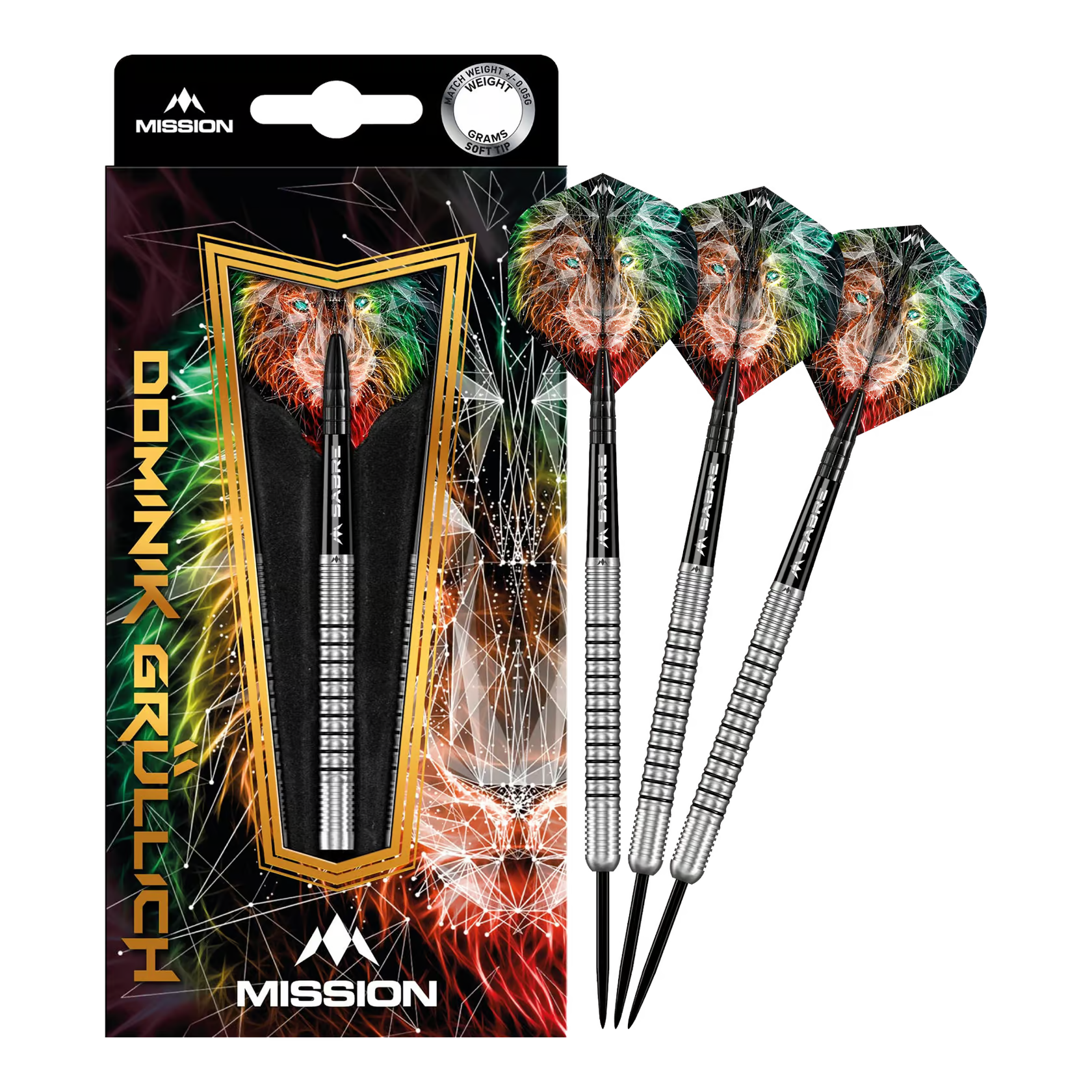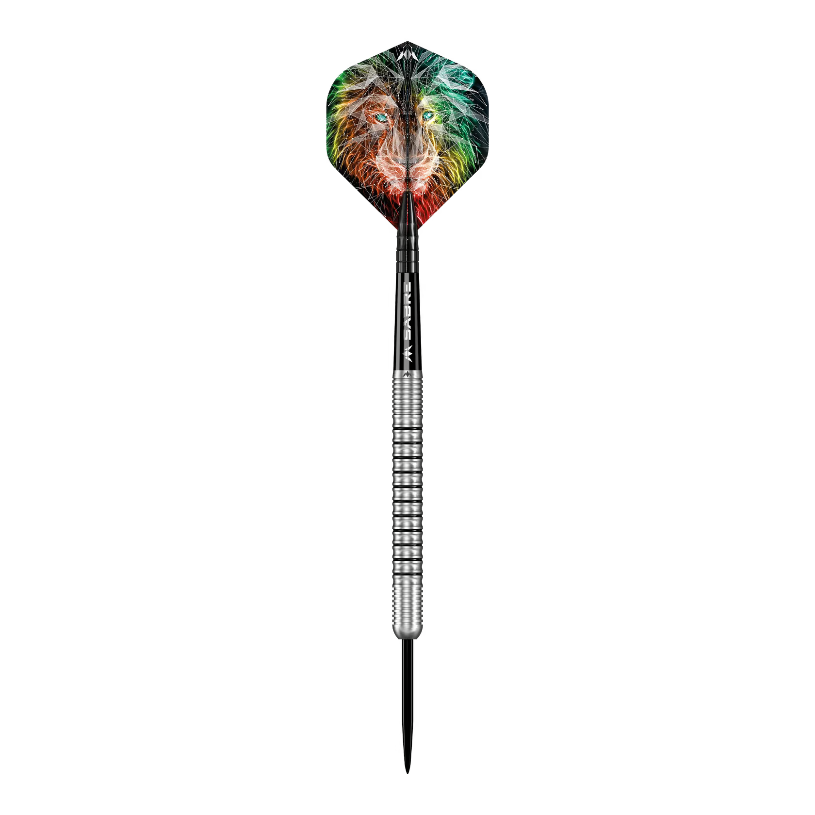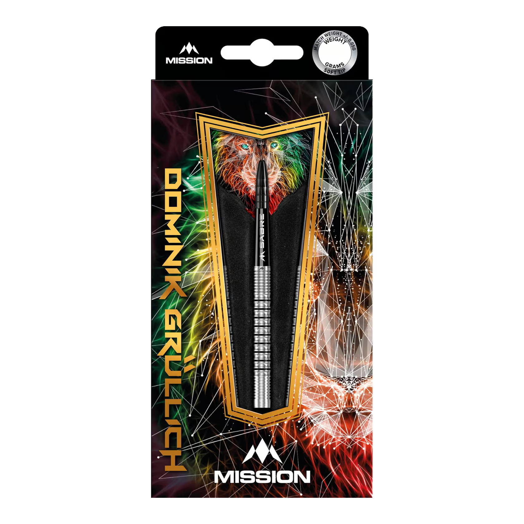 Das Design des geraden Barrels mit Ringgriff umfasst eine Mischung aus radialen Rillen über die gesamte Länge des Barrels, die durch schwarz lackierte Ringe hervorgehoben werden. Das Barrel mündet in einem schwarzen Mission Sabre-Schaft, der den Flight an Ort und Stelle hält. Der Dart hat eine schwarze Spitze und das Mission-Logo ist auf der Rückseite des Barrels per Laser eingraviert.