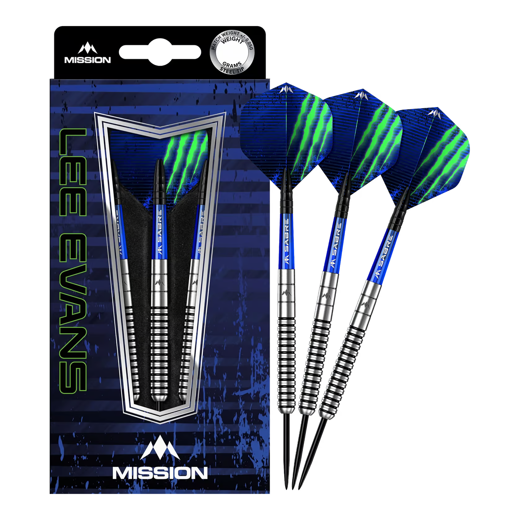 Das Set kommt mit schwarzen Mission Sabre Shafts und Lee Evans Flights.