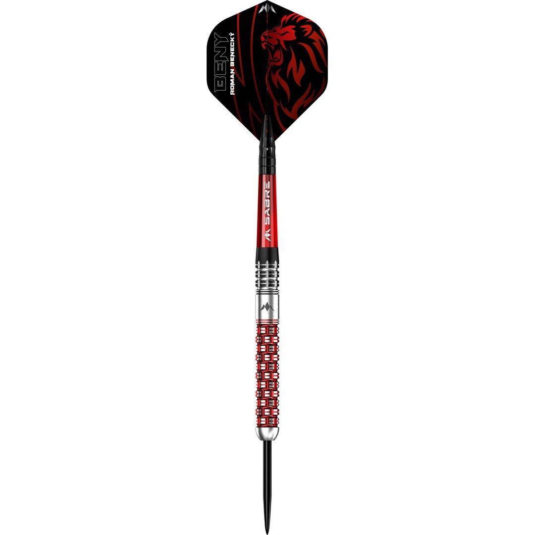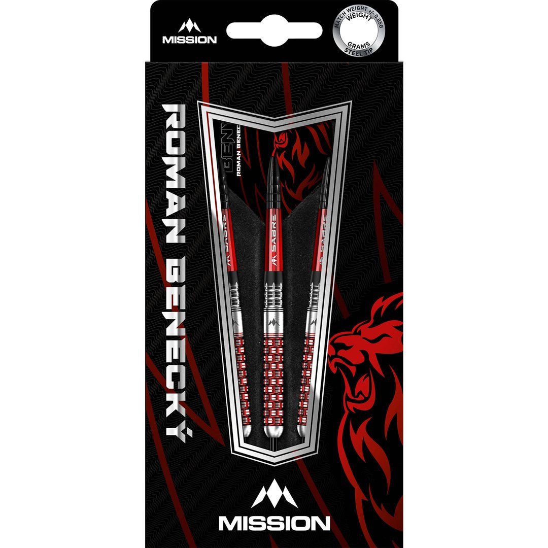 Der Dart ist mit einem Mission-Logo versehen, das per Laser in die Rückseite des Barrels eingraviert ist, und verfügt über einen Sabre-Schaft in transparentem Rot mit schwarzer Aluminiumspitze, um den Signature-Flight von Roman „Beny“ Benecký fest im Griff zu haben.