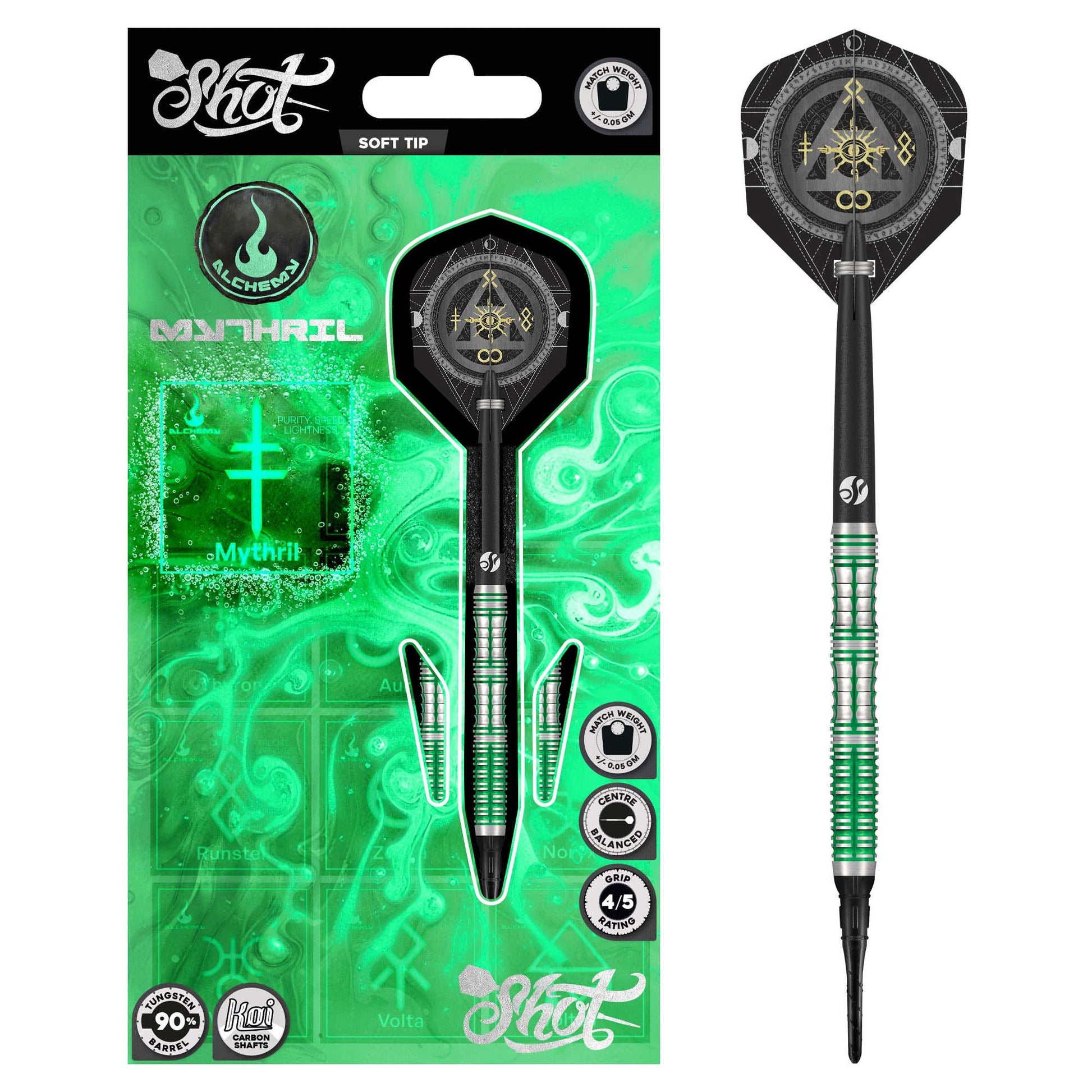 Erleben Sie kontrollierte Präzision und raffinierte Wolframverarbeitung mit den Alchemy Mythril 90% Softtip Darts.