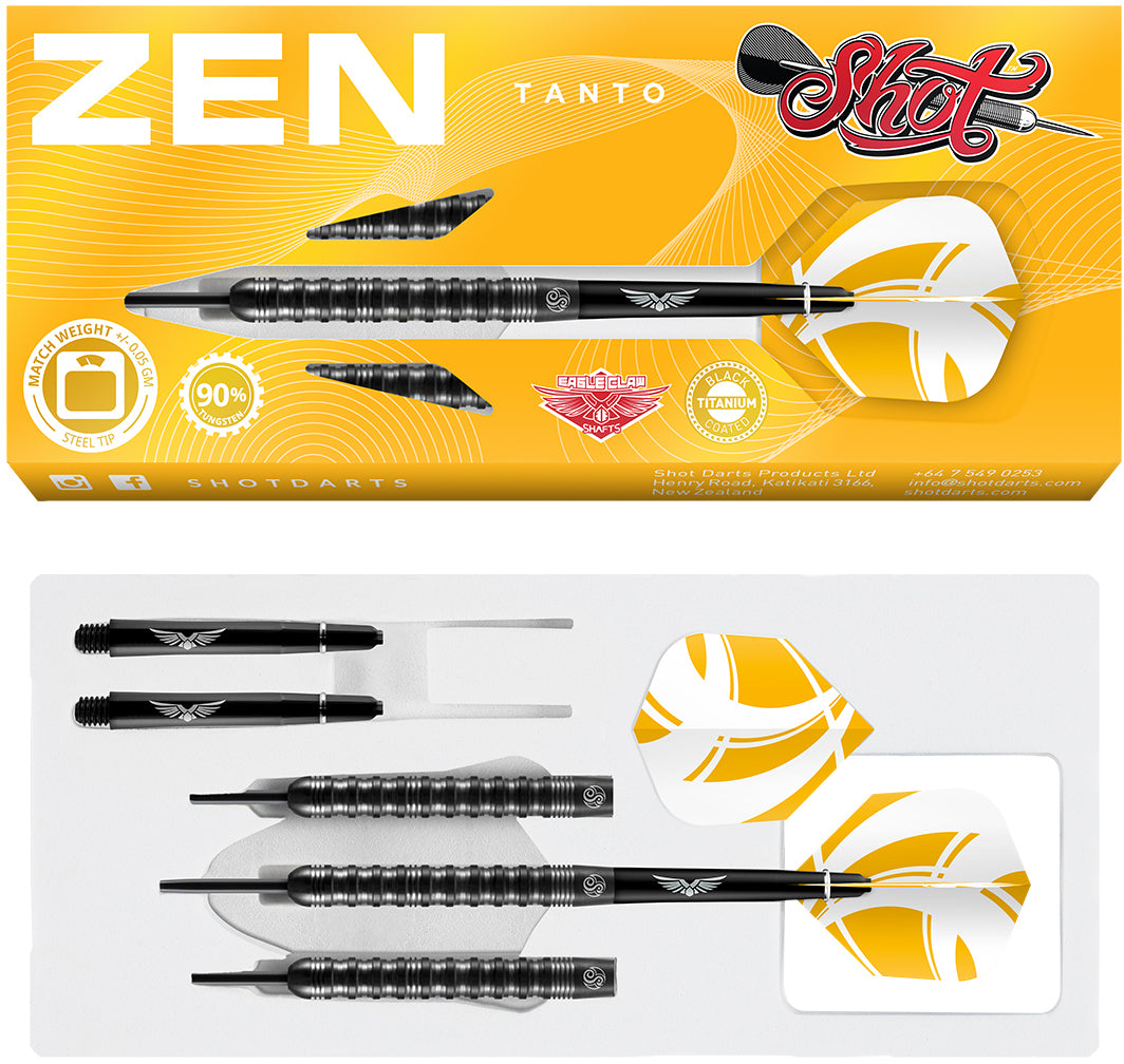 Der gerade TShot Zen Tanto Dart-Barrel wurde entwickelt, um Ihnen zu einem besseren Spiel zu verhelfen. Mit einem stabilen, neu entwickelten Pyramidengriff von der Spitze bis zum Ende, einer Ummantelung aus glattem schwarzem Titan und einem Mittelgewicht ist Tanto Ihr Kompass – er zeigt Ihnen den Weg.