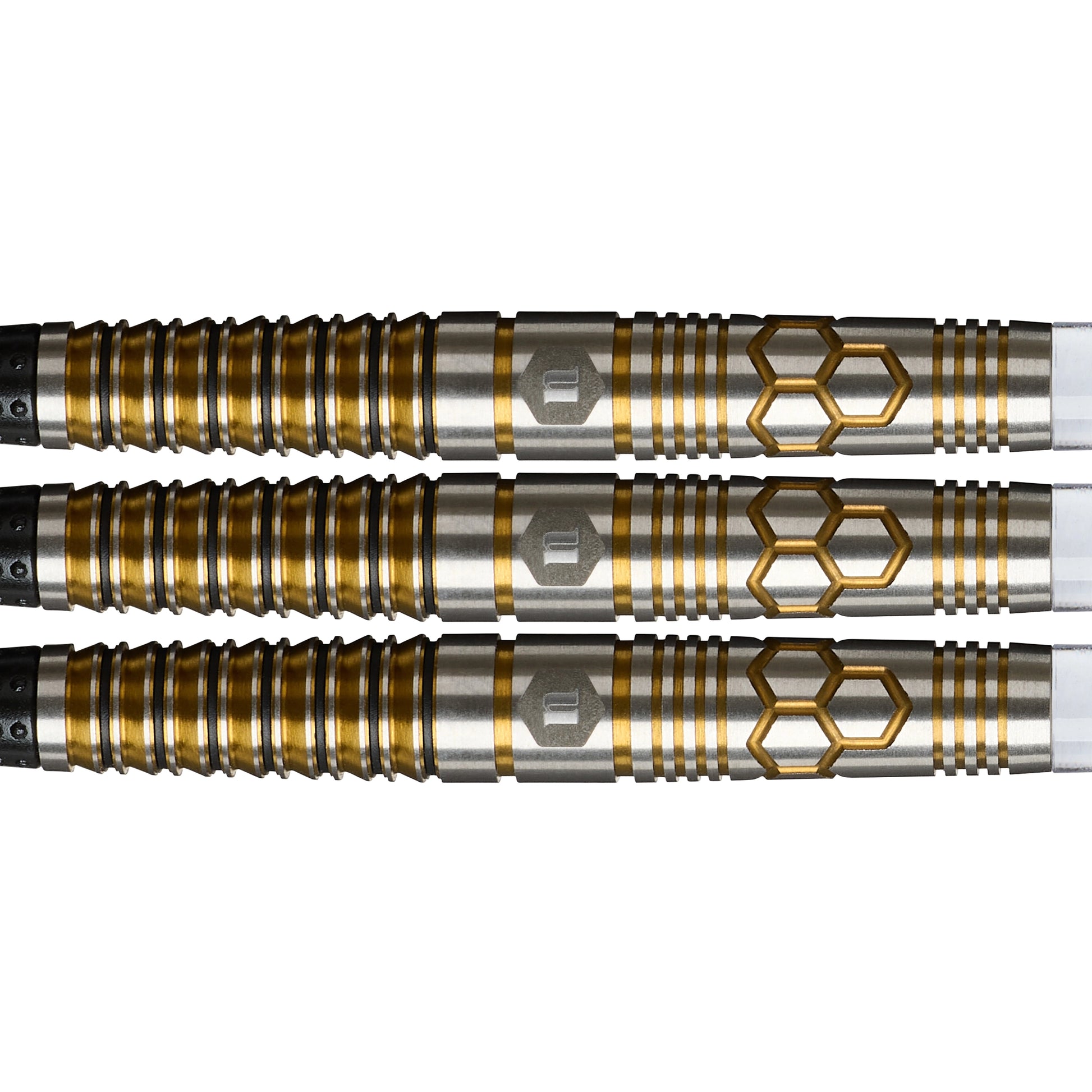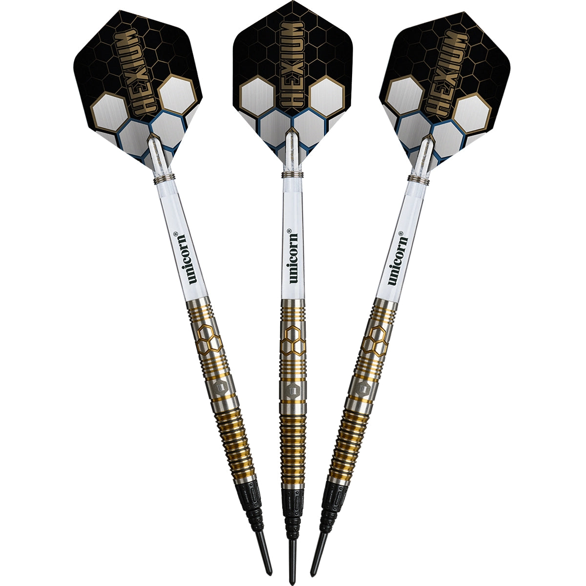 Erleben Sie die perfekte Verschmelzung von Luxus und Präzision mit den Unicorn Hexium 03 Gold 90 % Softtip-Darts.